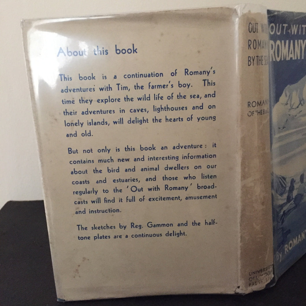 ’Out With Romany By The Sea’ by G. Bramwell Evens (Romany of the BBC.) Published by University of London Press. August 1941. UK 1st edition. The book is in very good condition with no marks and a gift inscription dated 1941 on the fep. The dust wrapper is in good + condition and is not price clipped. There is loss to the top and base of the spine and light wear/loss to the corners. There are a few tears at the top edge of the front cover. We have others from this hugely popular BBC series.