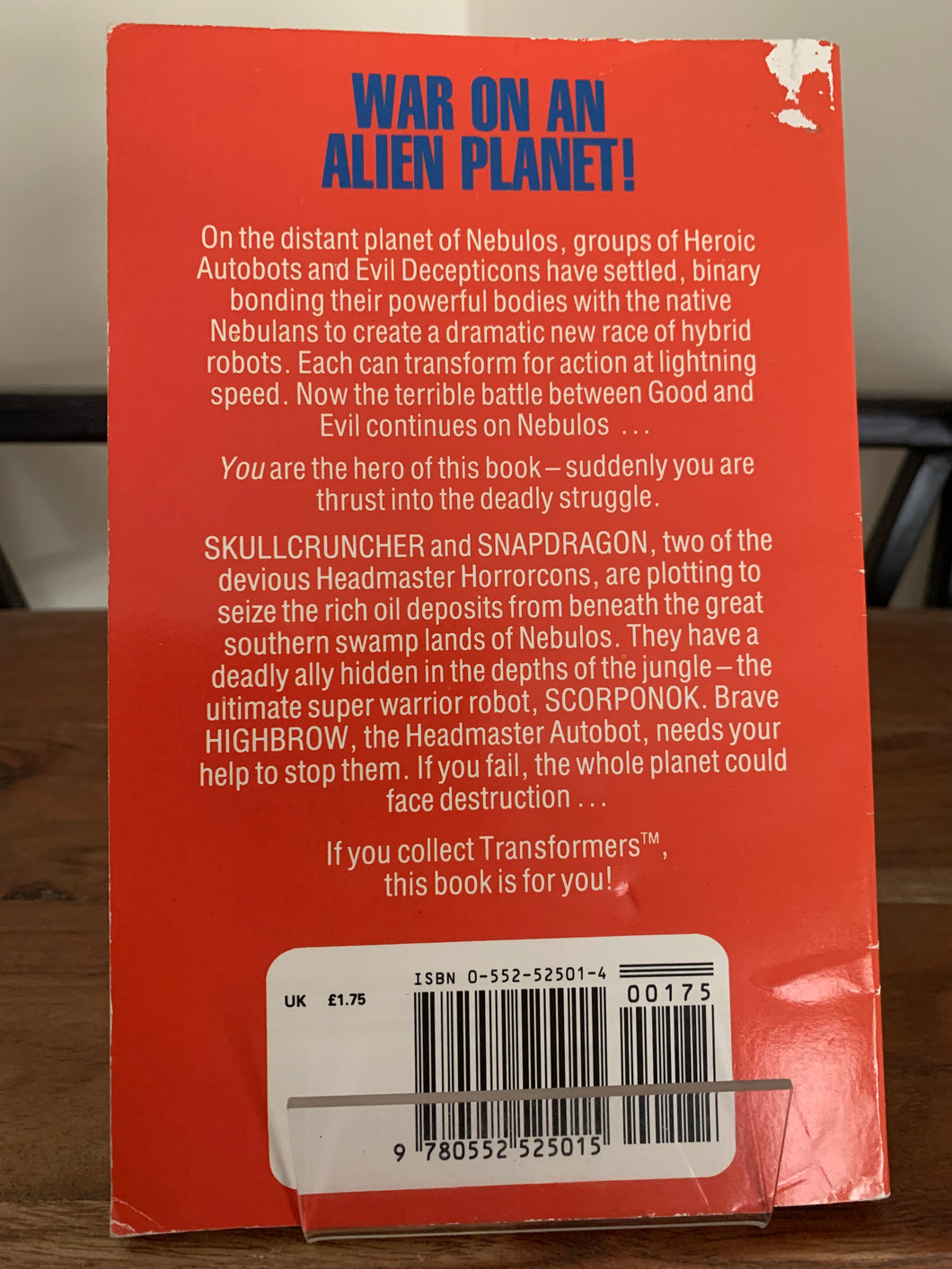’The Transformers: Adventure Game Books - Swamp of the Scorpion’ by Dave Morris. Illustrated by Bob Harvey. Published by Young Corgi Books. 1987. UK 1st edition. Card covers.