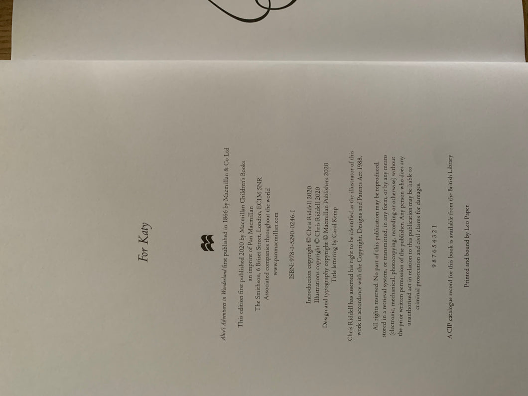 ’Alice's Adventures in Wonderland’ by Lewis Carroll. Illustrated by Chris Riddell. Published by Macmillan. 2020 UK 1st edition thus.