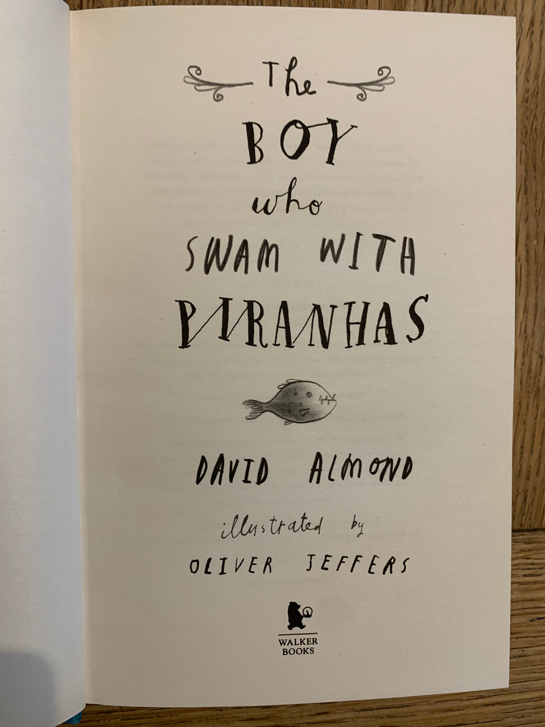 ’The Boy who Swam with Paranhas’ by David Almond. Illustrated by Oliver Jeffers. Published by Walker Books. 2012. UK 1st edition. Laminated decorated boards.