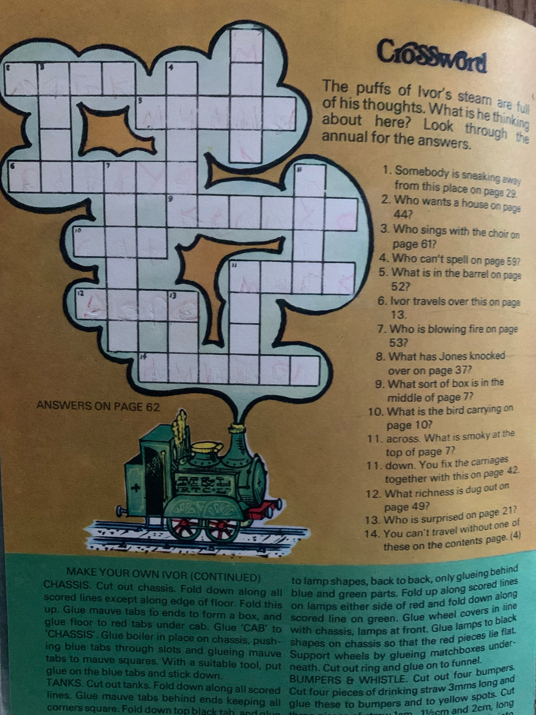 Internally, the two colouring pages have been completed in colour pencils and subsequently erased as has the crossword puzzle. One of the engines has been coloured on page 54.