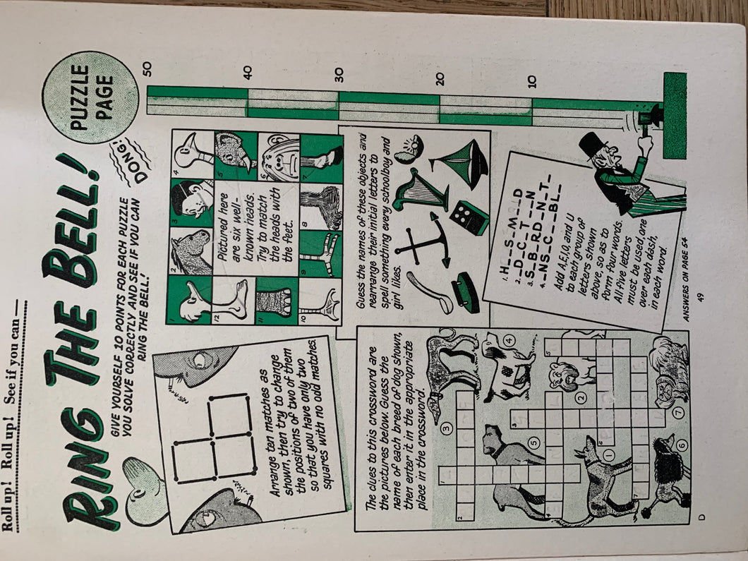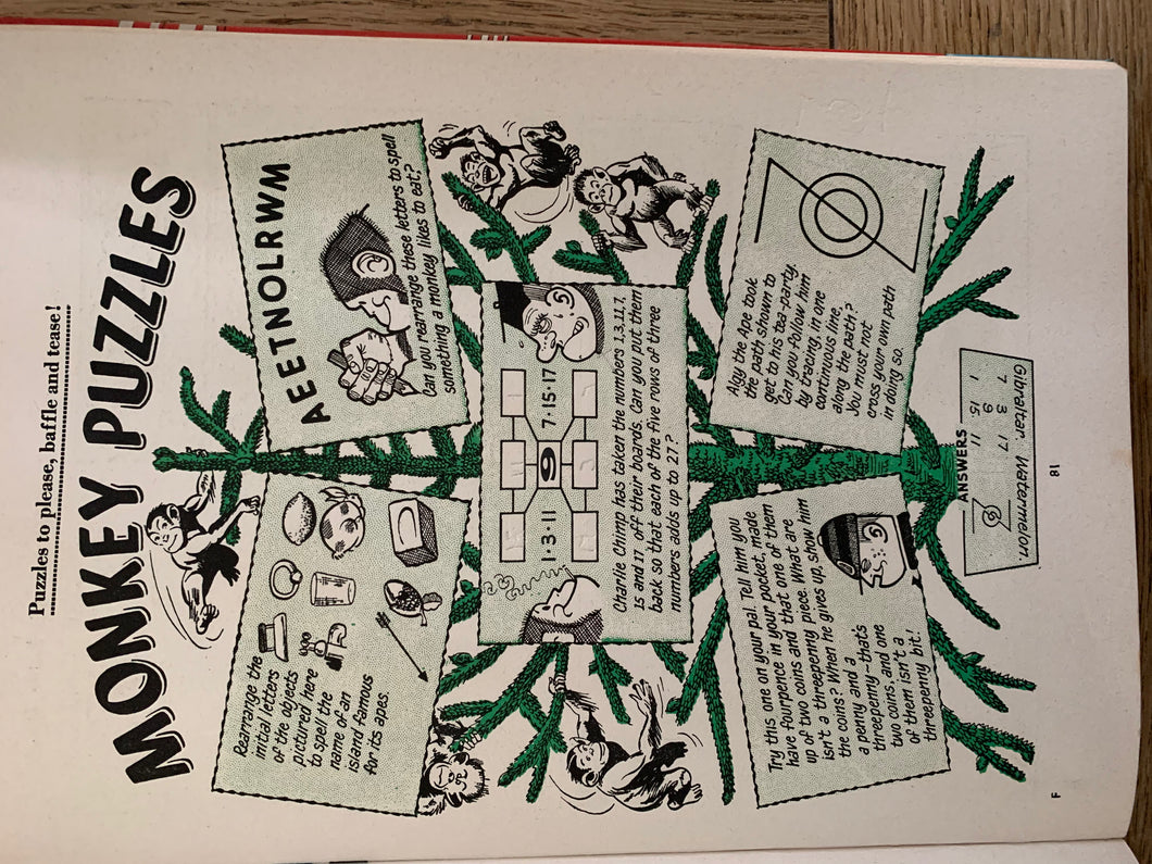 The book is in very good + condition with no marks or inscriptions, and the pages clear and bright, and the book belongs to section is clear. The puzzles look like they've been neatly completed then erased by the previous owner. The page edges lightly foxed. A small piece of the laminate covering is missing, just above the N on the front cover, and a small section near to the top corner of the rear cover is blistered, with no loss.