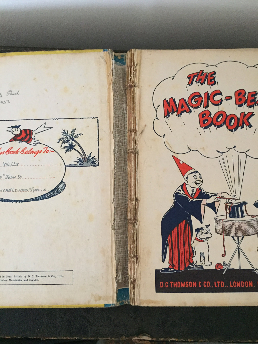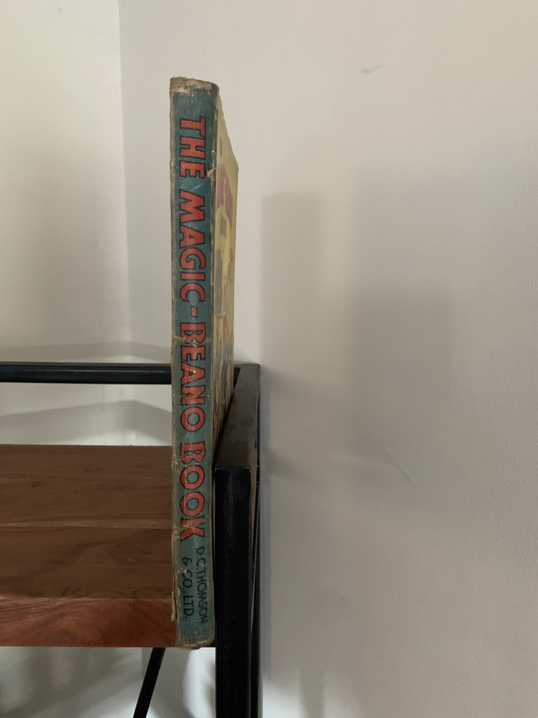 ‘The Magic-Beano Book 1948’ Published by D.C.Thompson. 1947. UK 1st edition. Pictorial boards. No dust wrapper as issued. The book is in good condition only. The book belongs to has been neatly completed and there is a small gift dedication above it. No colouring, writing etc inside. The book is not price clipped. The pages are tanned with age. The binding has become separated between the front cover and the pages. The covers are dusty and marked and there is some wear to board edges, corners and covers.
