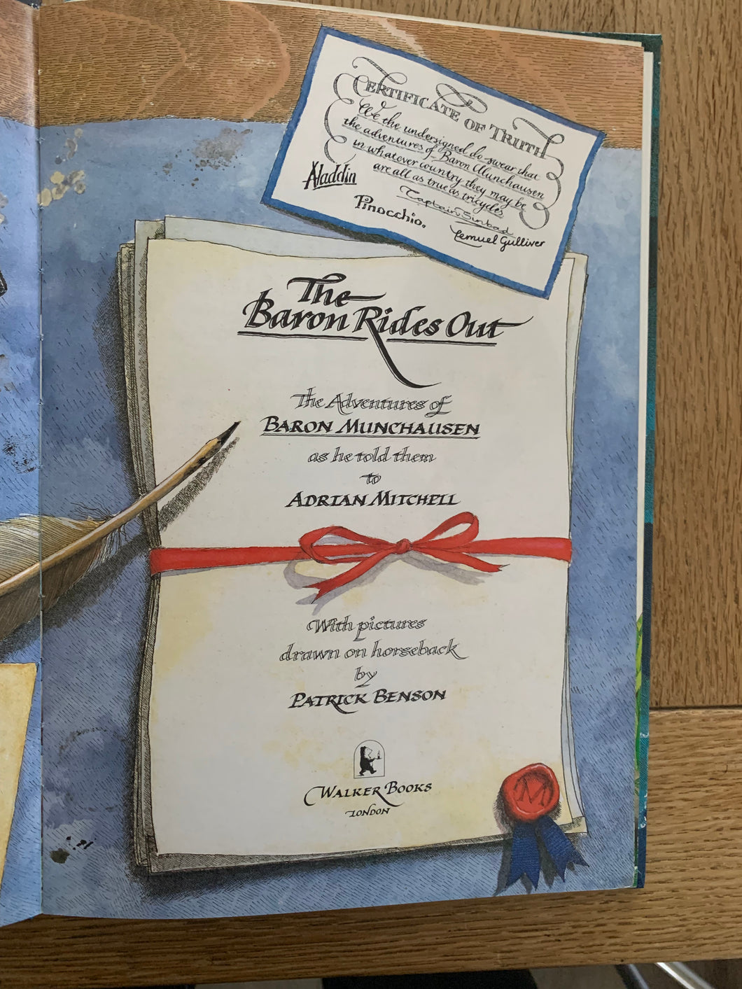 ‘The Baron Rides Out’ by Adrian Mitchell. Illustrated by Patrick Benson. Published by Walker Books. 1985. UK 1st edition. Laminated pictorial boards,. No dust wrapper as issued.