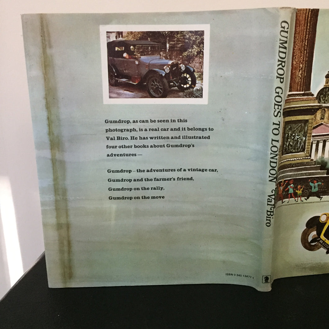 ‘Gumdrop Goes To London’ written and illustrated by Val Biro. Published by Brockhampton Press 1971. UK 1st edition. Pictorial boards. The book is in very good + condition, with no marks or inscriptions. The dustwrapper is also in very good + condition, and is not price clipped. There is the outline of old sellotape showing through from the reverse of the rear cover. The fifth adventure from the famous Austin Clifton vintage car.