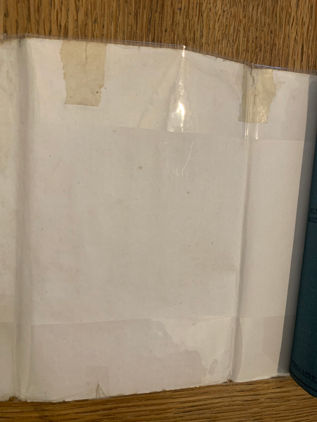 The dust wrapper is in very good condition and is not price clipped. There is wear to the top and base of the spine, which is discoloured, and corners. The rear cover is dusty, and has repaired tears by the previous owner using tape to the top, base and top corner. The wrapper comes with a clear unattached protective cover.