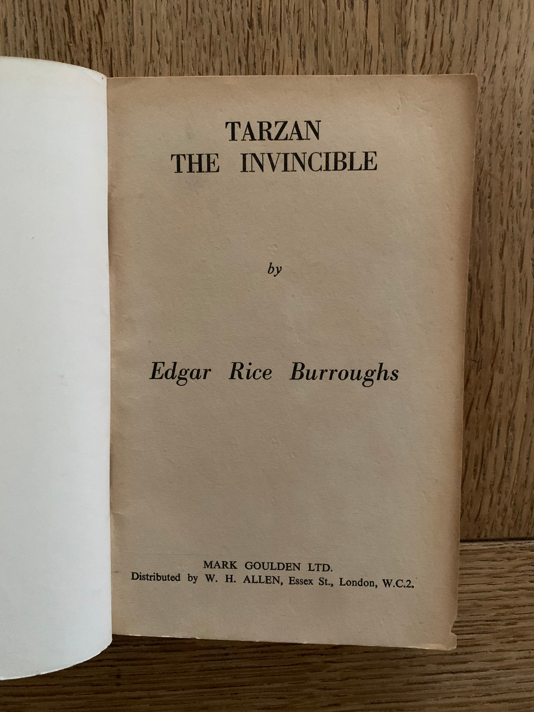’Tarzan The Invincible’ by Edgar Rice Burroughs. Published by Mark Goulden. Undated. UK paperback edition. Card covers.