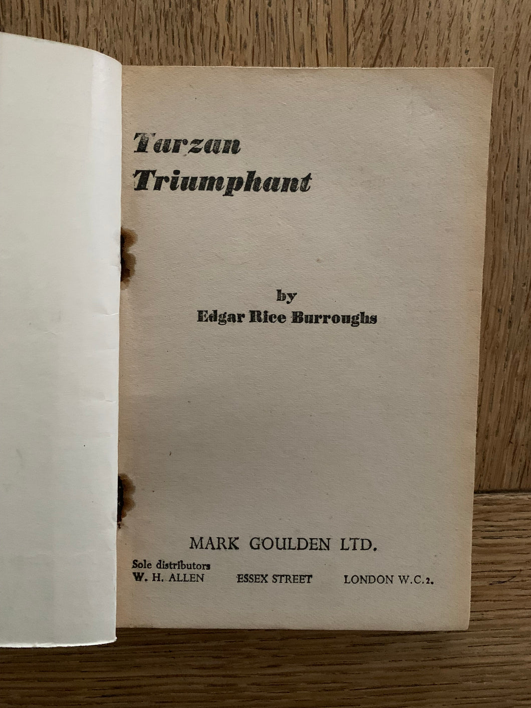 ’Tarzan Triumphant’ by Edgar Rice Burroughs. Published by Mark Goulden. Undated. UK paperback edition. Card covers.