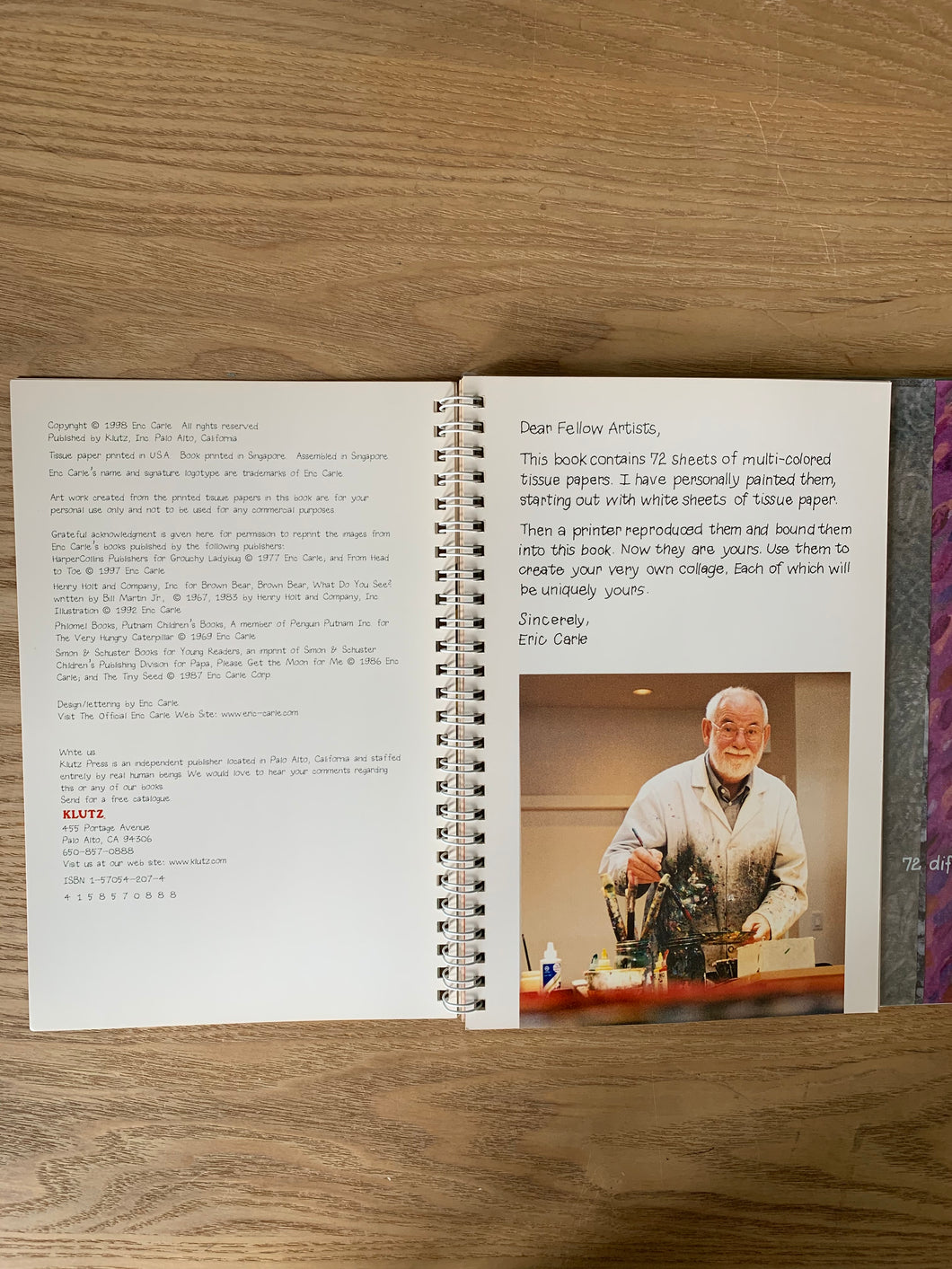 The book contains 72 sheets of tissue paper, designed and painted by Eric Carle and then printed and bound to the book. Complete with instructions and inspirations.