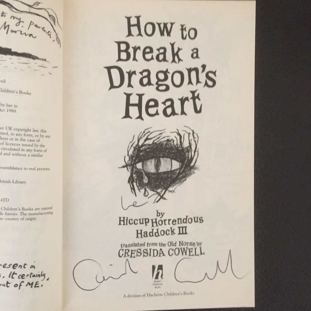 ‘How To Break a Dragon's Heart’ written and illustrated by Cressida Cowell. Published by Hodder. 2009. UK 1st paperback edition. Card covers. The book is in very good + condition with no marks or inscriptions. The base of the spine and cover corners are ever so slightly creased. Signed by the author on the title page and with the authors dragon stamp on the fep. Book 8 in the hugely popular 'How To Train Your Dragon' series.