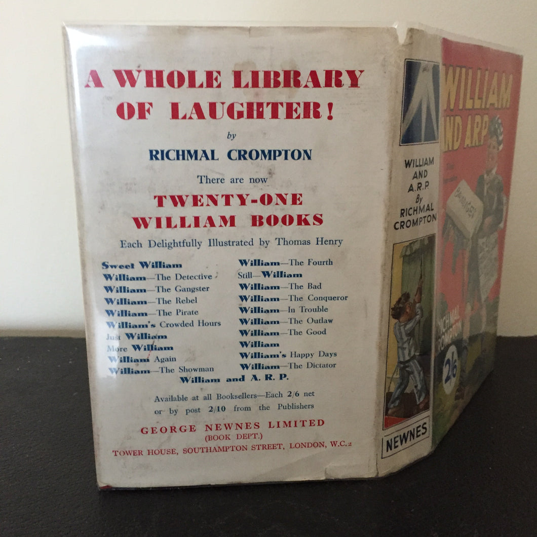 ‘William and A.R.P.' by Richmal Crompton. Illustrated by Thomas Henry. Published by Newnes. October 1939. UK 2nd reprint edition. The book is in very good + condition with no marks or inscriptions. The dustwrapper is in very good condition and is not price clipped. There is a tear at the top edge of the front cover and one to the top of the rear cover/spine join and a couple of tiny tears to the rear cover edge.
