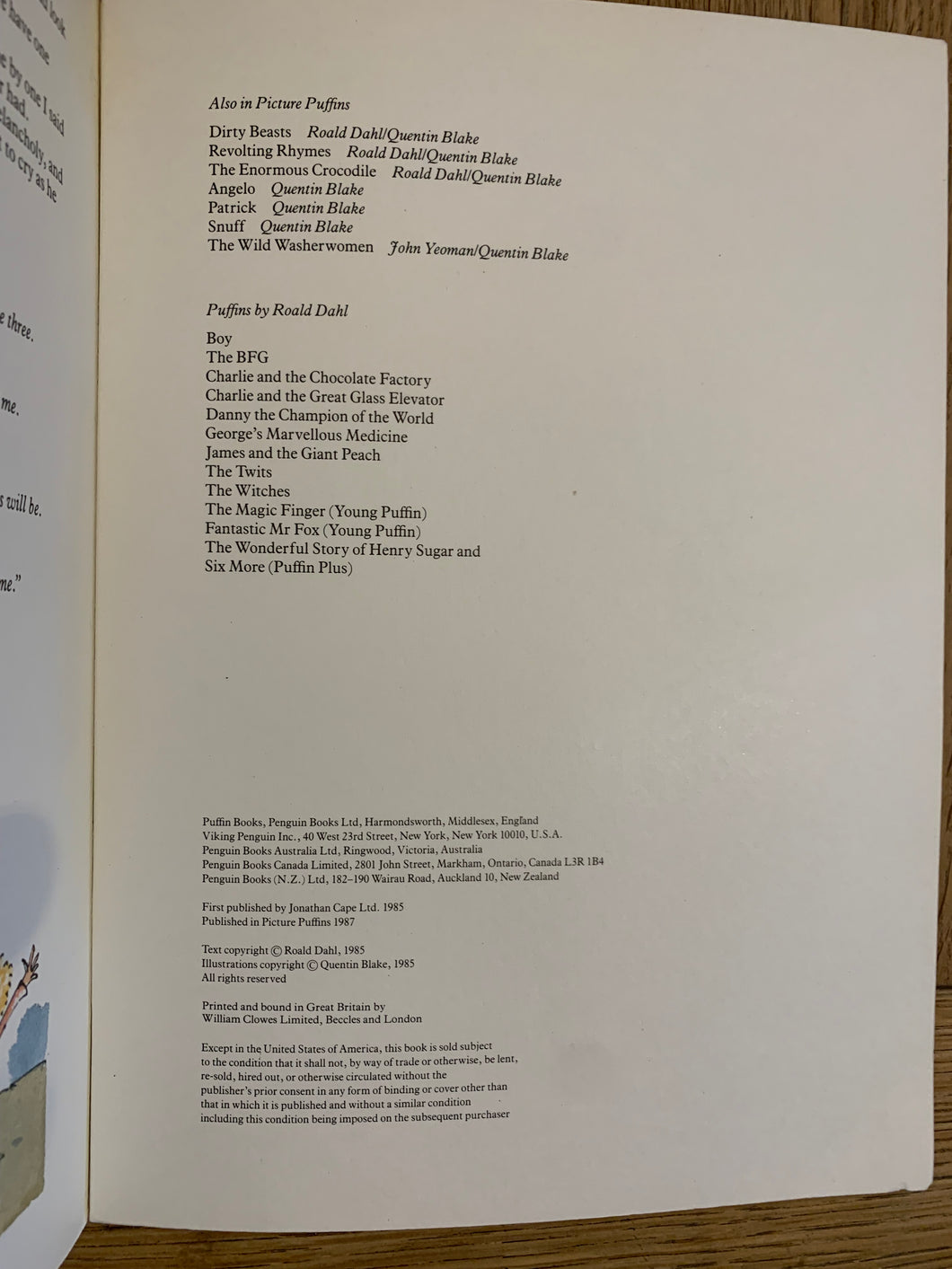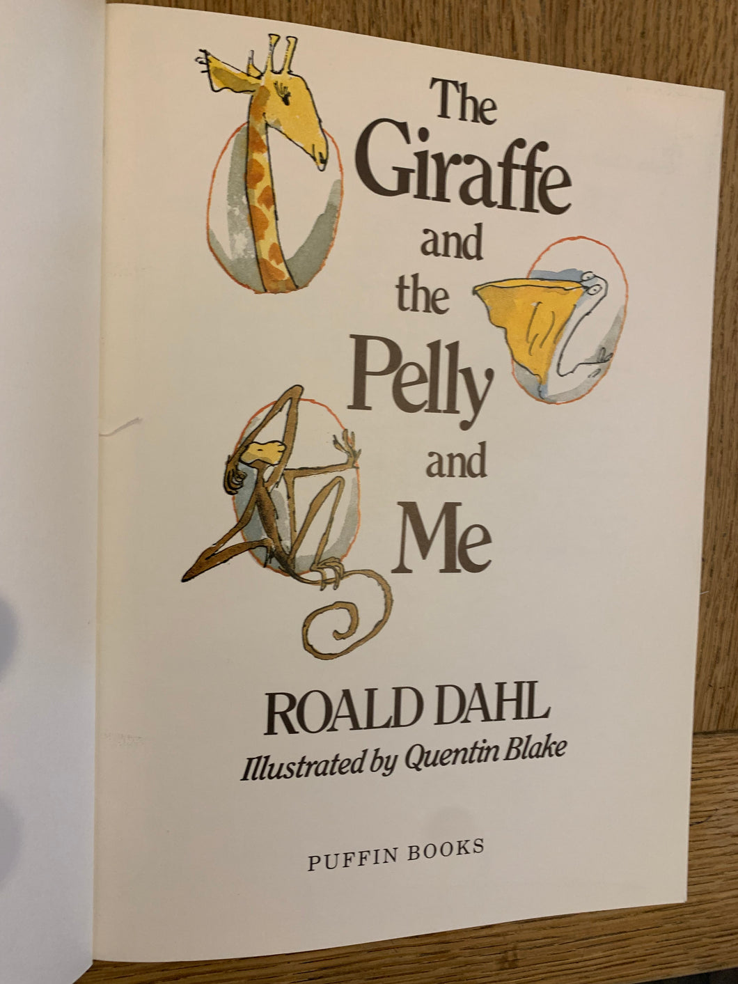 ‘The Giraffe and the Pelly and Me’ by Roald Dahl. Illustrated by Quentin Blake. Published by Penguin Books. 1987. UK 1st edition thus. Card Covers. A Puffin Picture Book.