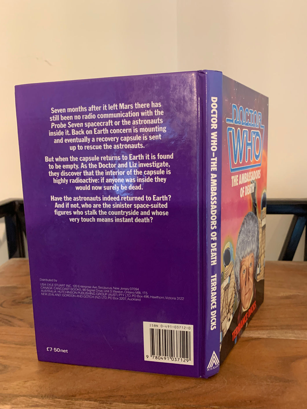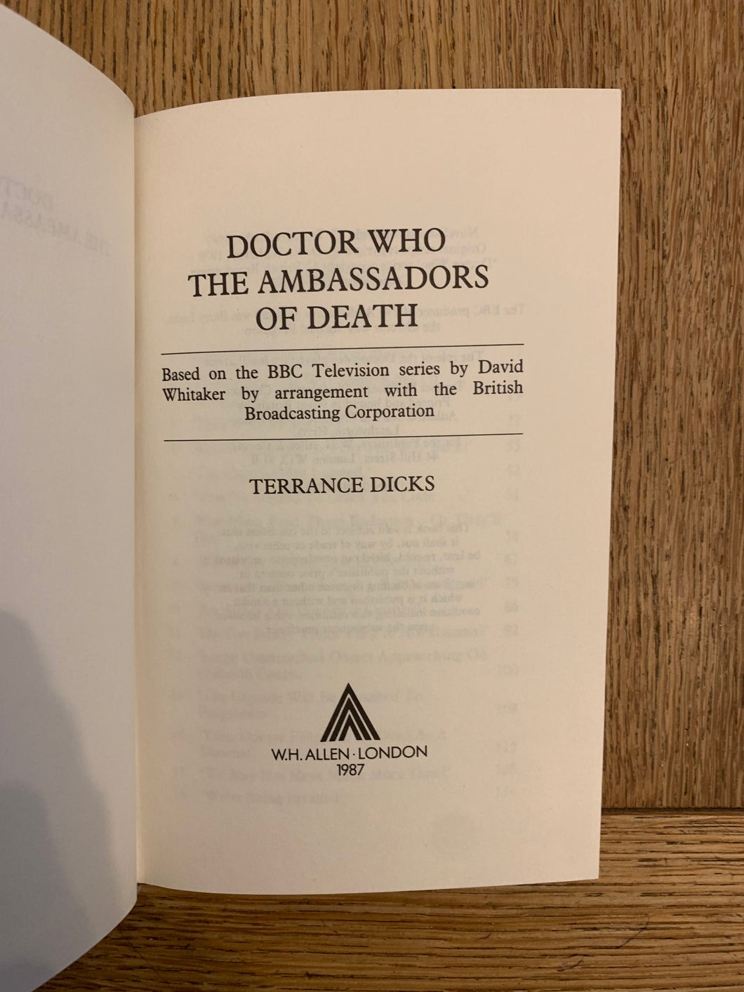 'Doctor Who - The Ambassadors of Death' by Terrance Dicks. Published by WH Allen. 1987. UK 1st edition. Laminated pictorial boards. No dust wrapper as issued.