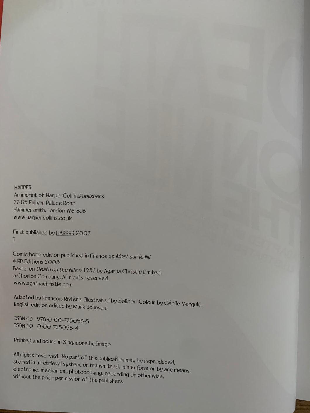 'Death on the Nile' by Agatha Christie. Adapted by Francois Rivere. Illustrated by Solidor. Published by Harper. 2007. UK 1st edition. Laminated pictorial boards. No dust wrapper as issued.