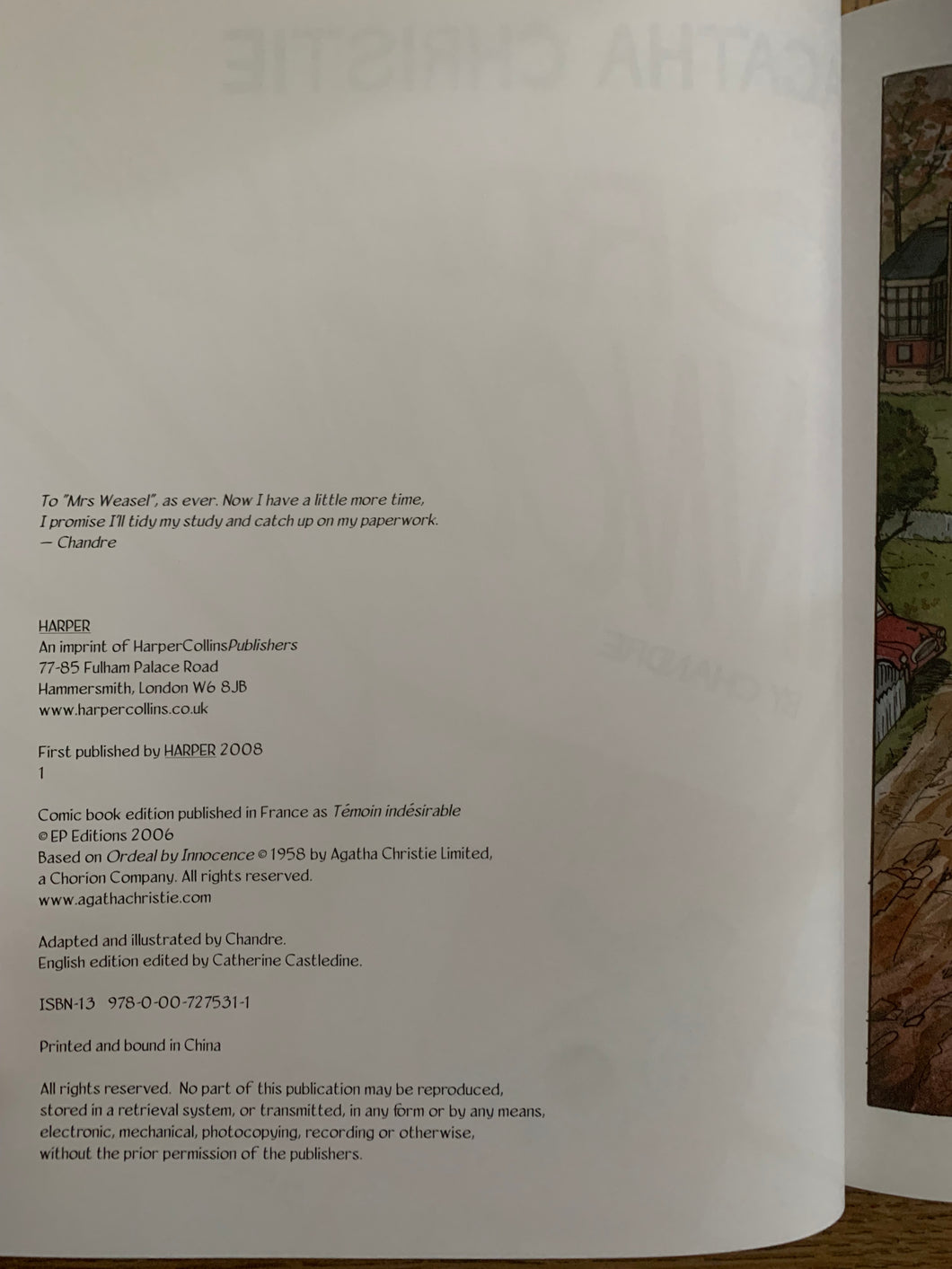 'Ordeal By Innocence' by Agatha Christie. Adapted and illustrated by Chandre. Published by Harper. 2008. UK 1st edition. Laminated pictorial boards. No dust wrapper as issued.