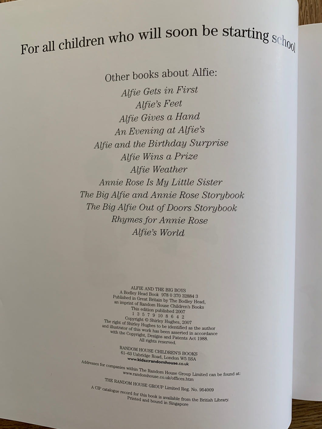 'Alfie and the Big Boys’ written and illustrated by Shirley Hughes. Published by Bodley Head. 2007. UK 1st edition. Laminated pictorial boards. No dust wrapper as issued.