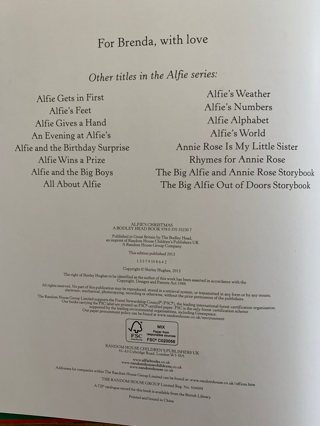 'Alfie's Christmas’ written and illustrated by Shirley Hughes. Published by Bodley Head. 2013. UK 1st edition.