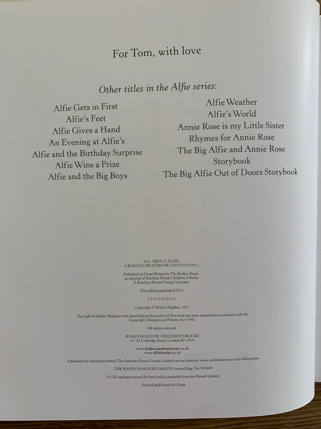 'All About Alfie’ written and illustrated by Shirley Hughes. Published by Bodley Head. 2011. UK 1st edition. Laminated pictorial boards. No dust wrapper as issued.