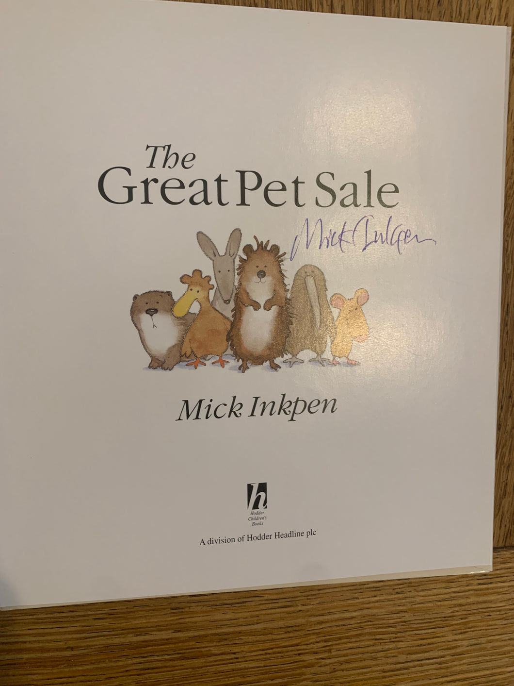 ’The Great Pet Sale’ written and illustrated by Mick Inkpen. Published by Hodder. 1998. UK 1st edition. Laminated pictorial boards. No dust wrapper as issued.