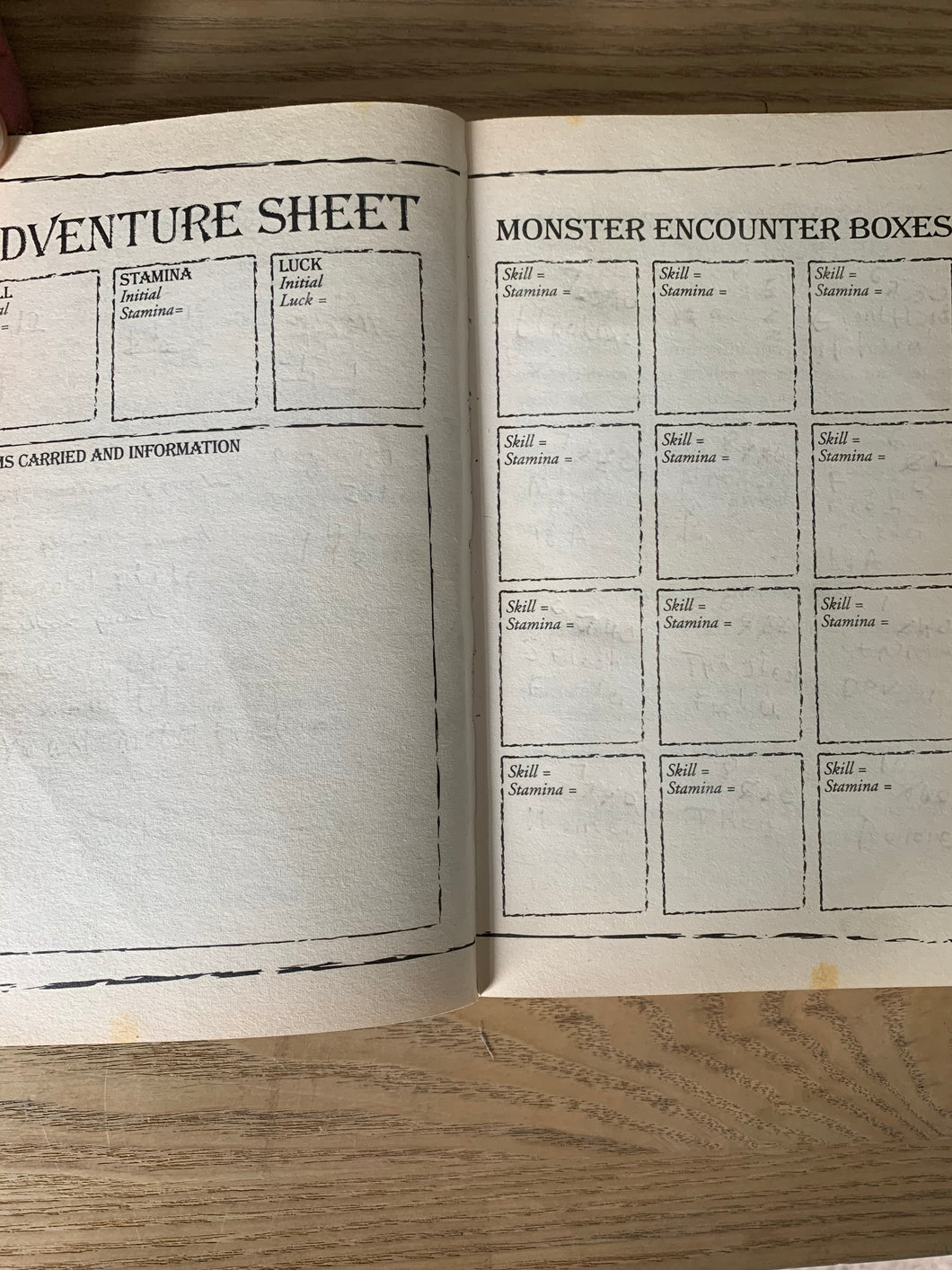 The book is in very good + condition with no inscriptions. The adventure sheets have been completed in pencil and erased, though the faint impressions remain, and there is some foxing/markings to the page edges.