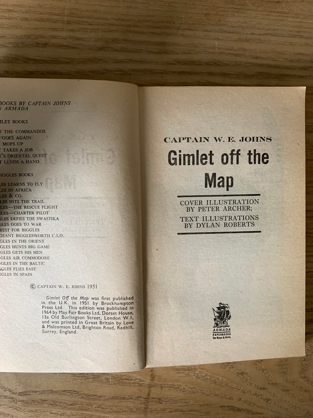 ‘Gimlet off the Map’ by Captain W.E Johns. Illustrated by Dylan Roberts. Published by May Fair Books. Armada Paperbacks. 1964. UK 1st edition thus. Card Covers.