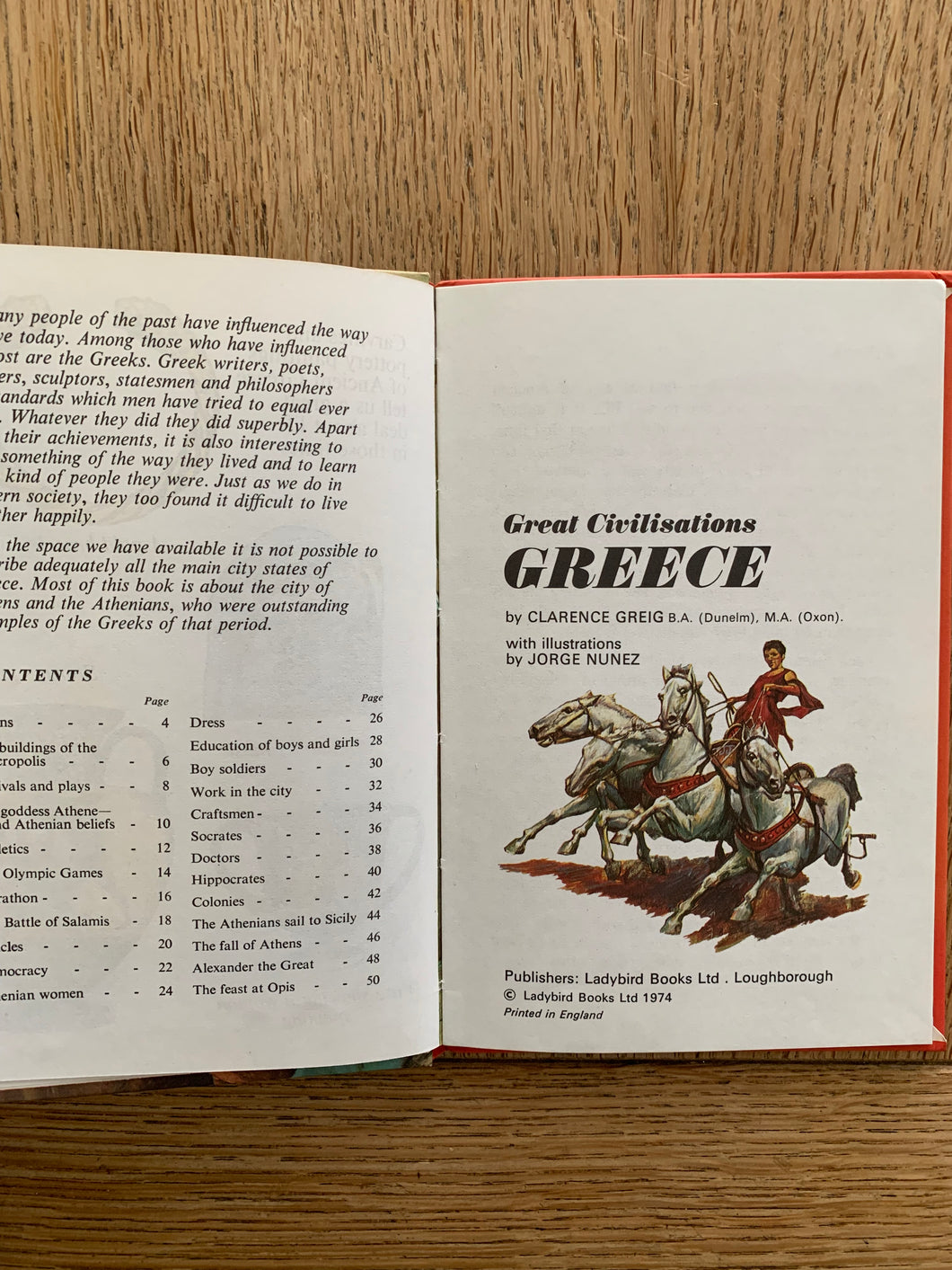'Great Civilisations: Greece' by Clarence Grieg. Illustrated by Jorge Nunez. Published by Ladybird Books. 1974. UK 1st edition. Decorative boards. No dust wrapper as issued. Count number 350.