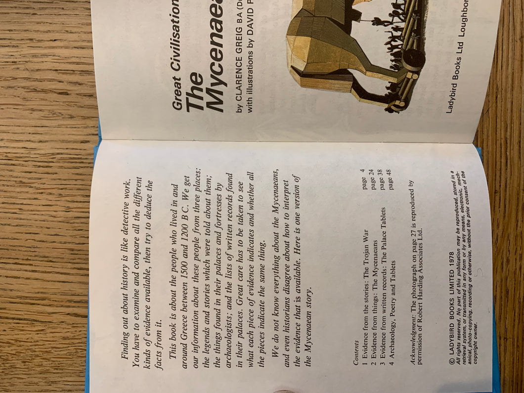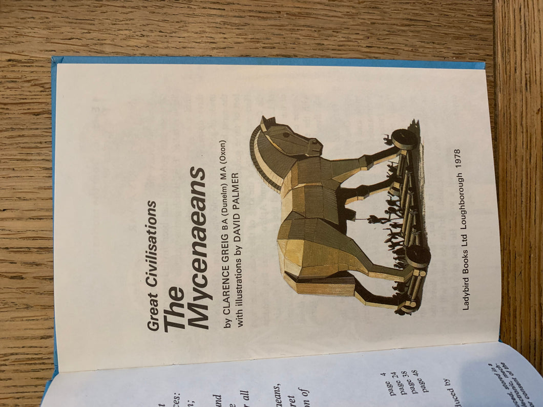 'Great Civilisations: The Mycenaeans' by Clarence Greig. illustrated by David Palmer. Published by Ladybird Books. 1978. UK reprint edition. Decorative boards. No dust wrapper as issued.