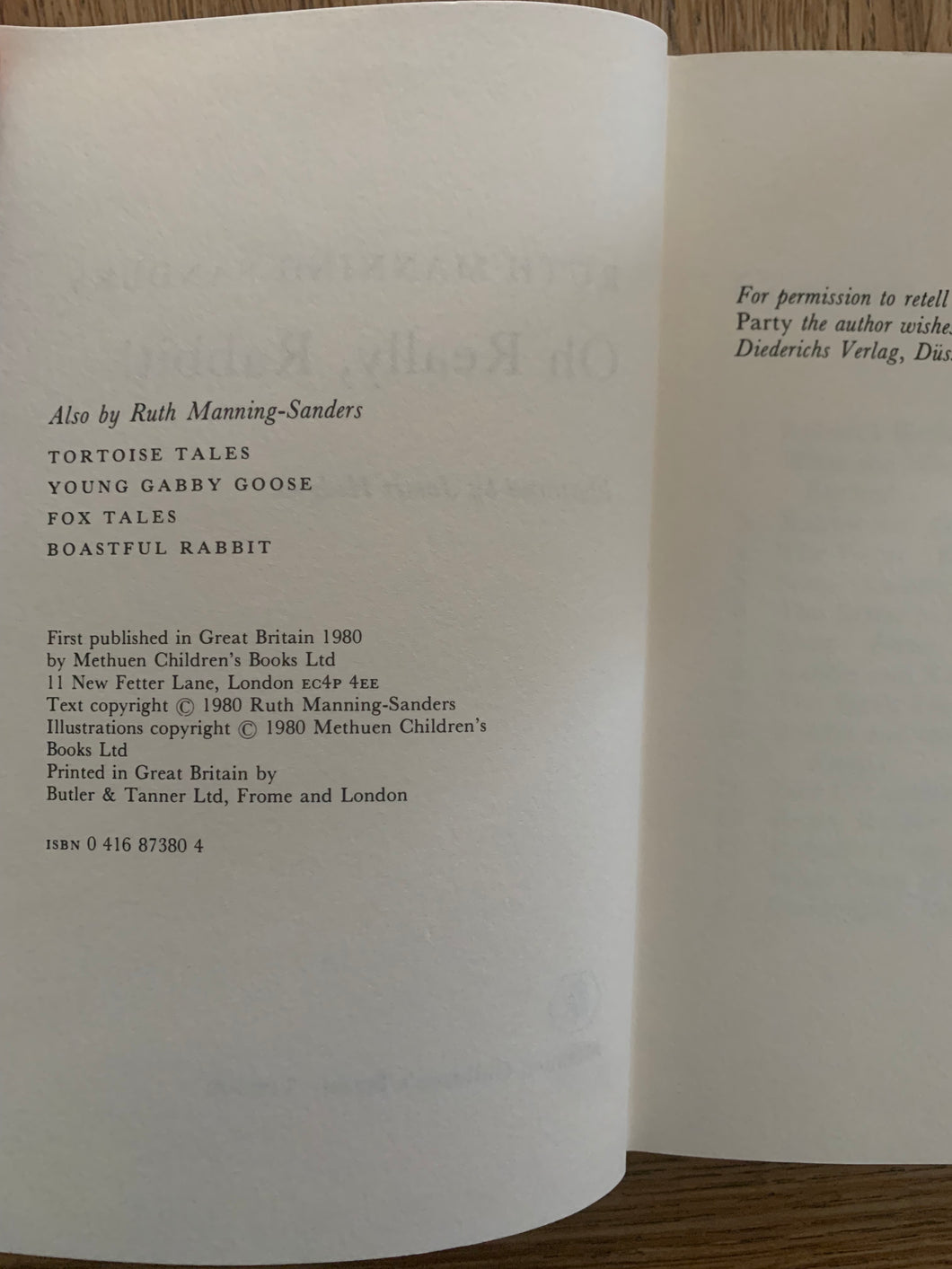 ’Oh Really, Rabbit!’ by Ruth Manning-Sanders. Illustrated by James Hodgson. Published by Methuen. 1980. UK 1st edition.