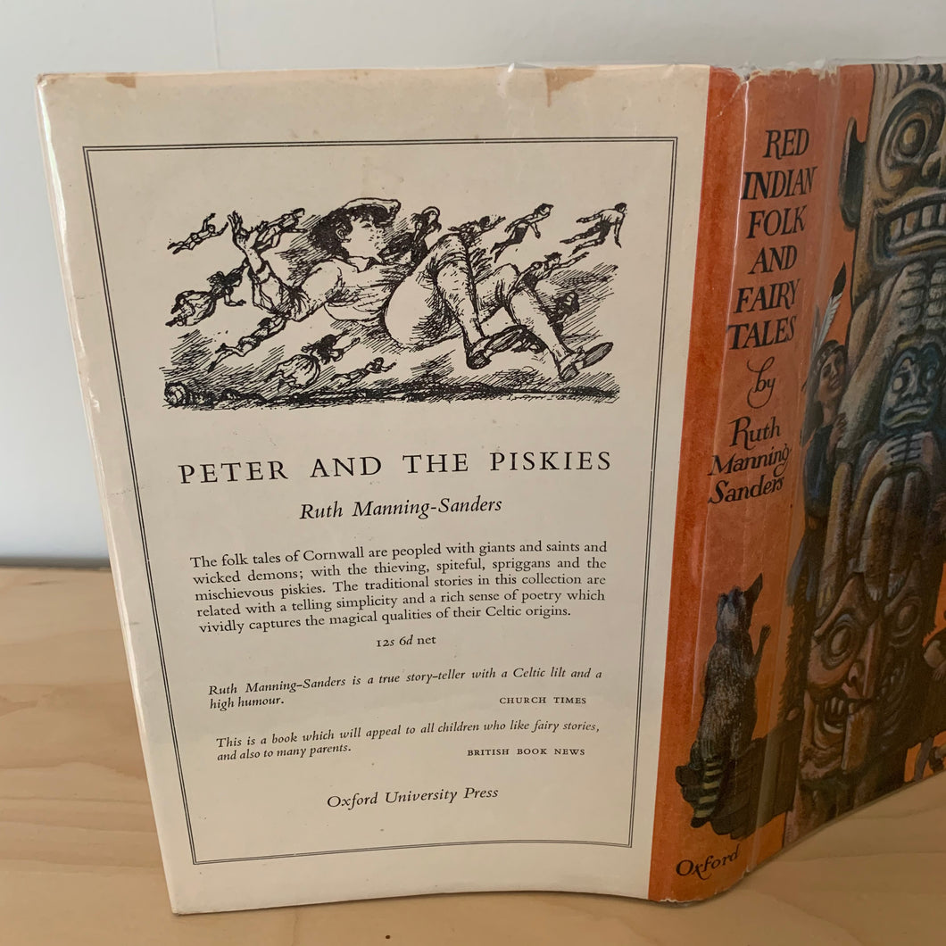 'Red Indian Folk and Fairy Tales’ by Ruth Manning-Sanders. Illustrated by C. Walter Hodges. Published by Oxford University Press. 1960. UK 1st edition. The book is in very good + condition with no inscriptions, and a small mark on the fep. The dust wrapper is in very good condition and is not price clipped. There is some light wear to the top/base of the spine and the corners. The wrapper comes with an unattached clear protective cover.