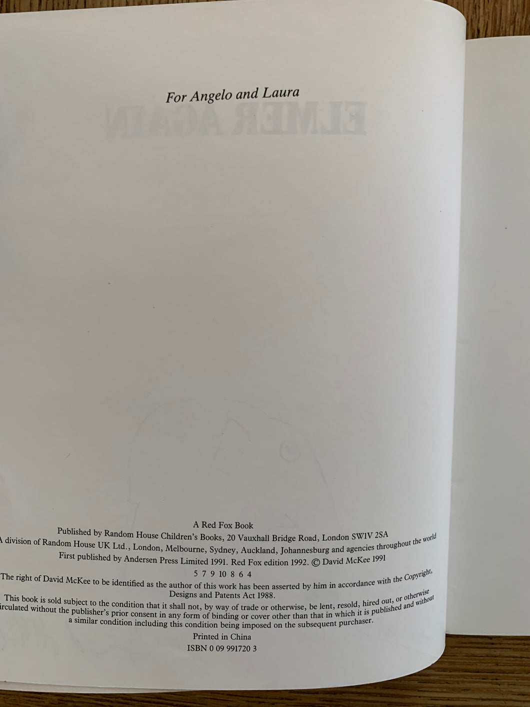 ‘Elmer Again' written and illustrated by David McKee. Published by Random House. Red Fox Edition 1992. Card covers.