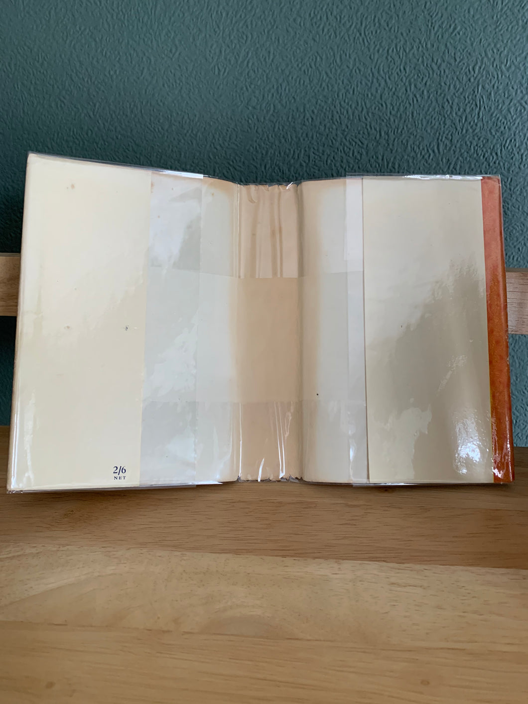 The dustwrapper is in very good condition and is not price clipped. The spine has some light wear and loss to the top/base of the spine, which is lightly sunned. There is some wear and very light loss to the corners, and a small piece missing from the rear cover. The wrapper comes with an unattached clear protective cover.