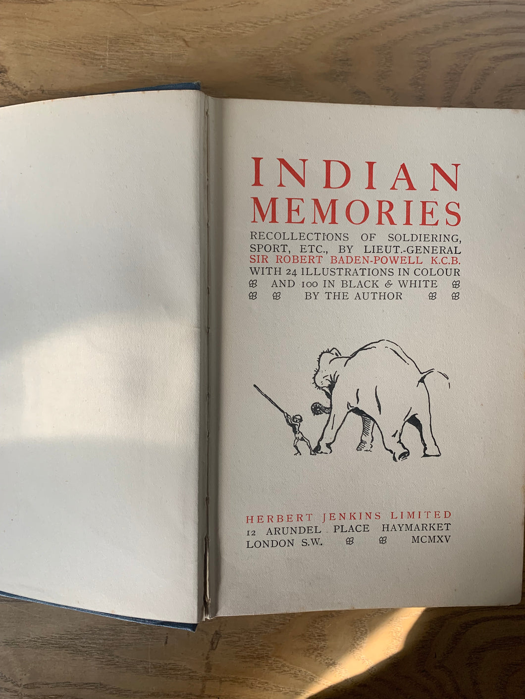 ’Indian Memories - Recollections of Soldiering, Sport etc’ written and illustrated by Lieut.-General Sir Robert Baden-Powell. Published by Herbert Jenkins. 1915. UK 1st edition. Embossed pictorial boards. No dust wrapper.
