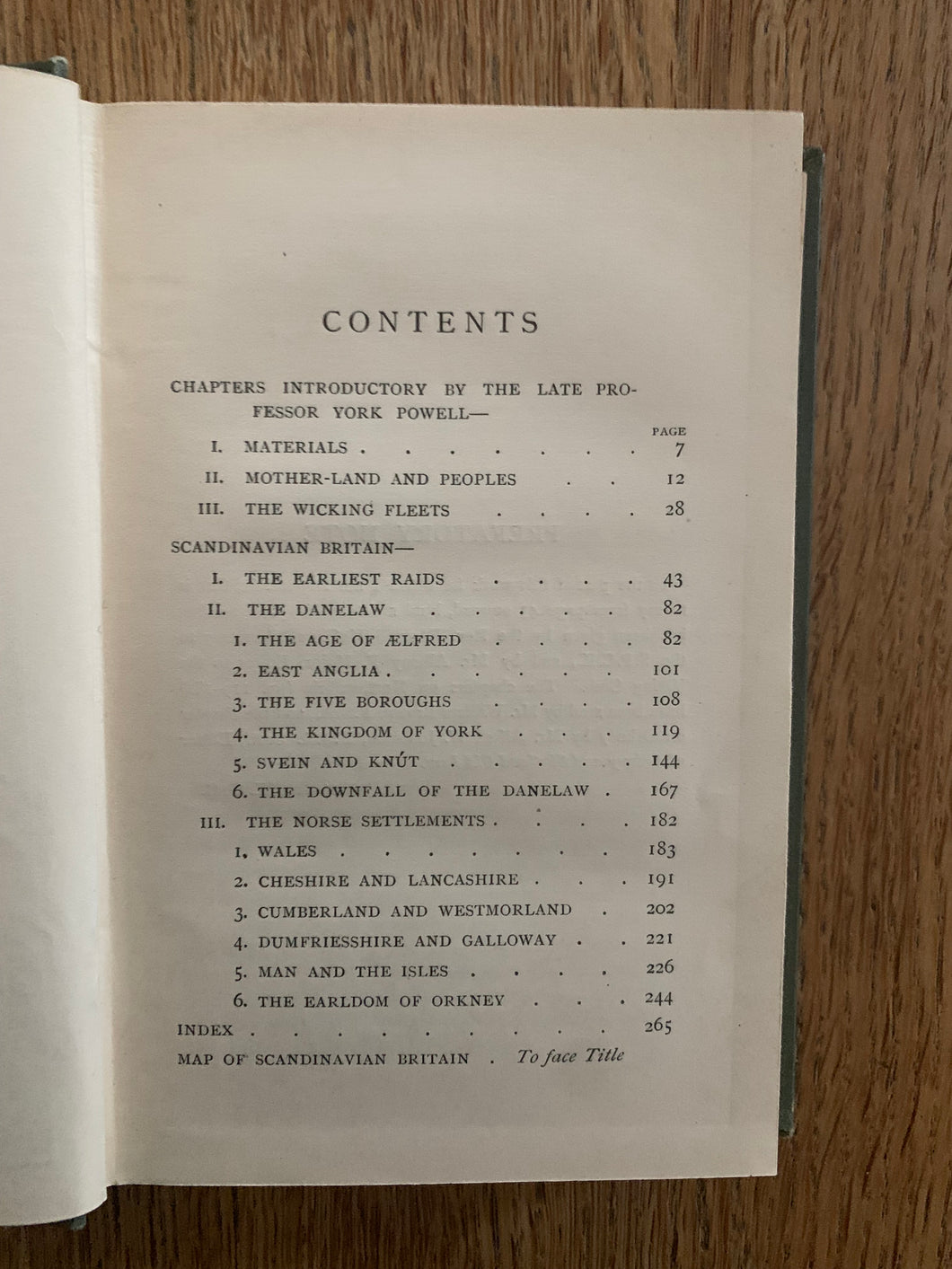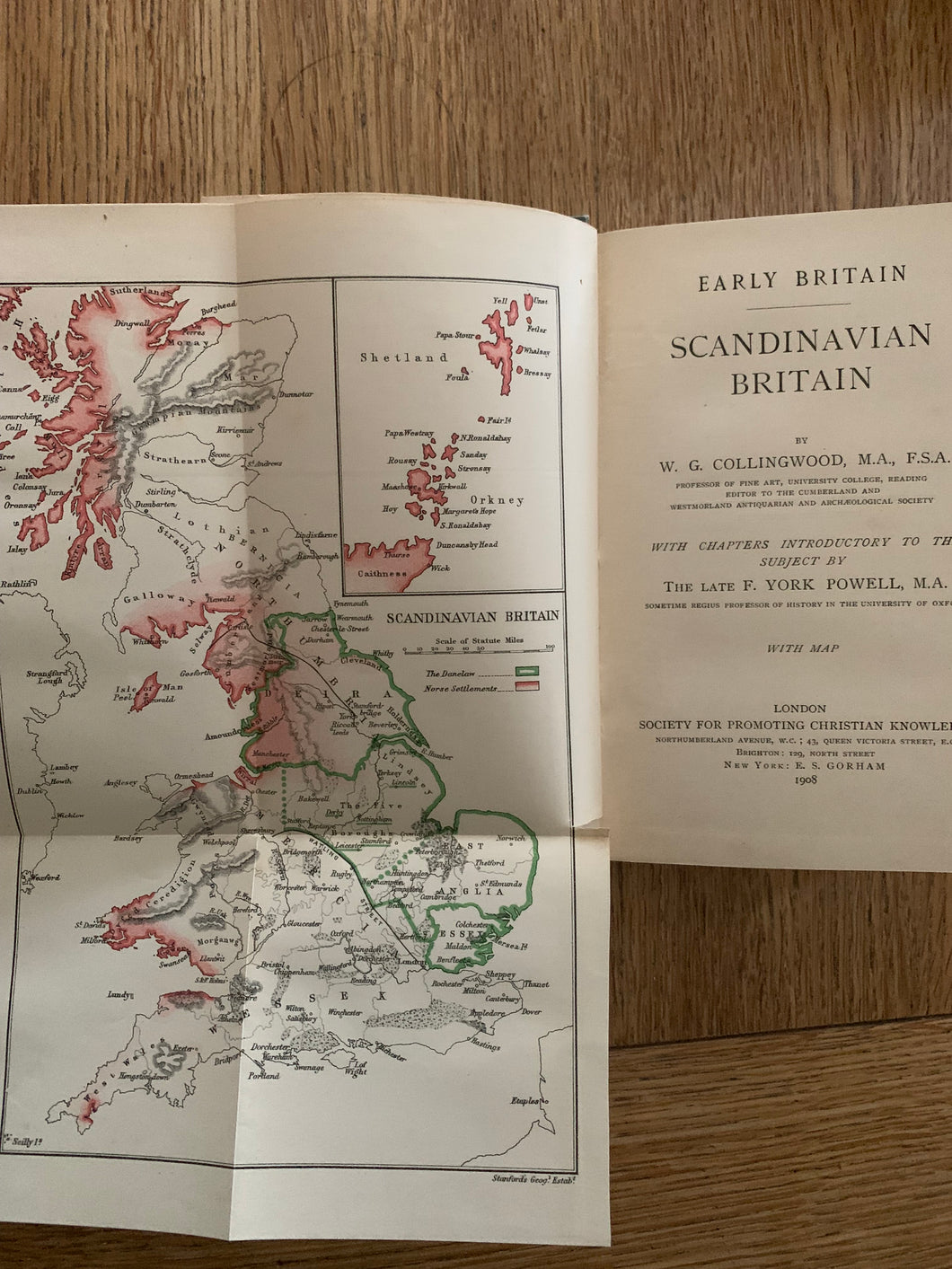 'Scandinavian Britain' by W.G. Collingwood. Published by SPCK. 1908. UK 1st edition. Decorated front cover and spine. No dust wrapper, with fold-out map.