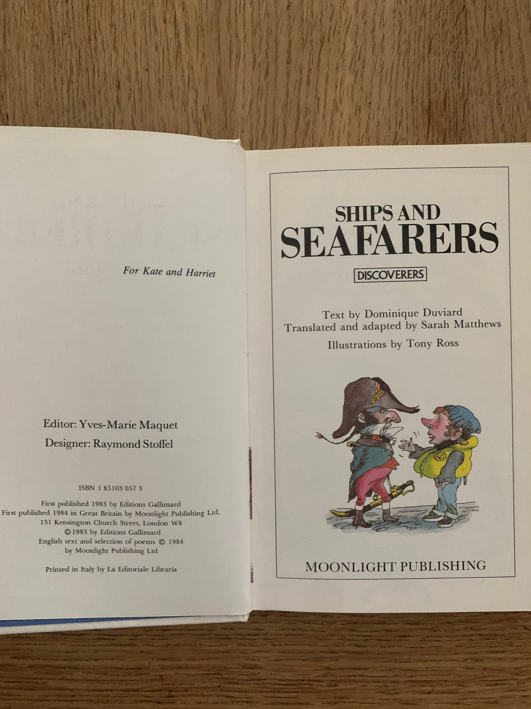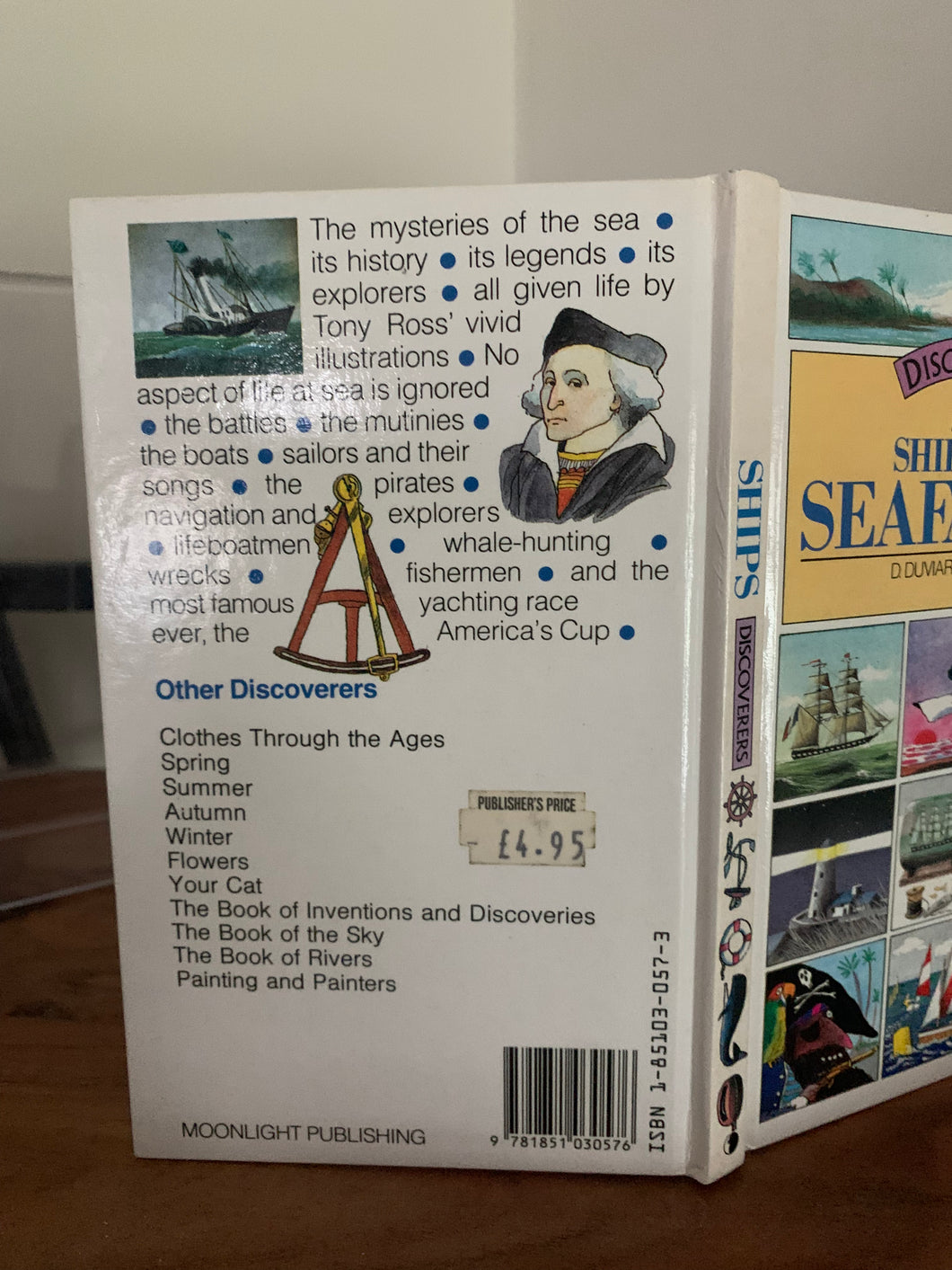 ’Ships and Seafarers’ by Dominique Duviard. Illustrated by Tony Ross. Published by Moonlight Publishing. 1984. UK 1st edition. Laminated pictorial boards with no dust wrapper as issued. Pocketbook size. Part of the Discoverers series.