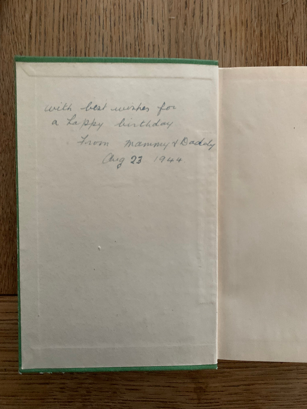 The book is in very good condition, with no marks and a gift inscription dated 1944 to the inside cover page. There is light wear and marks to the base of the spine.