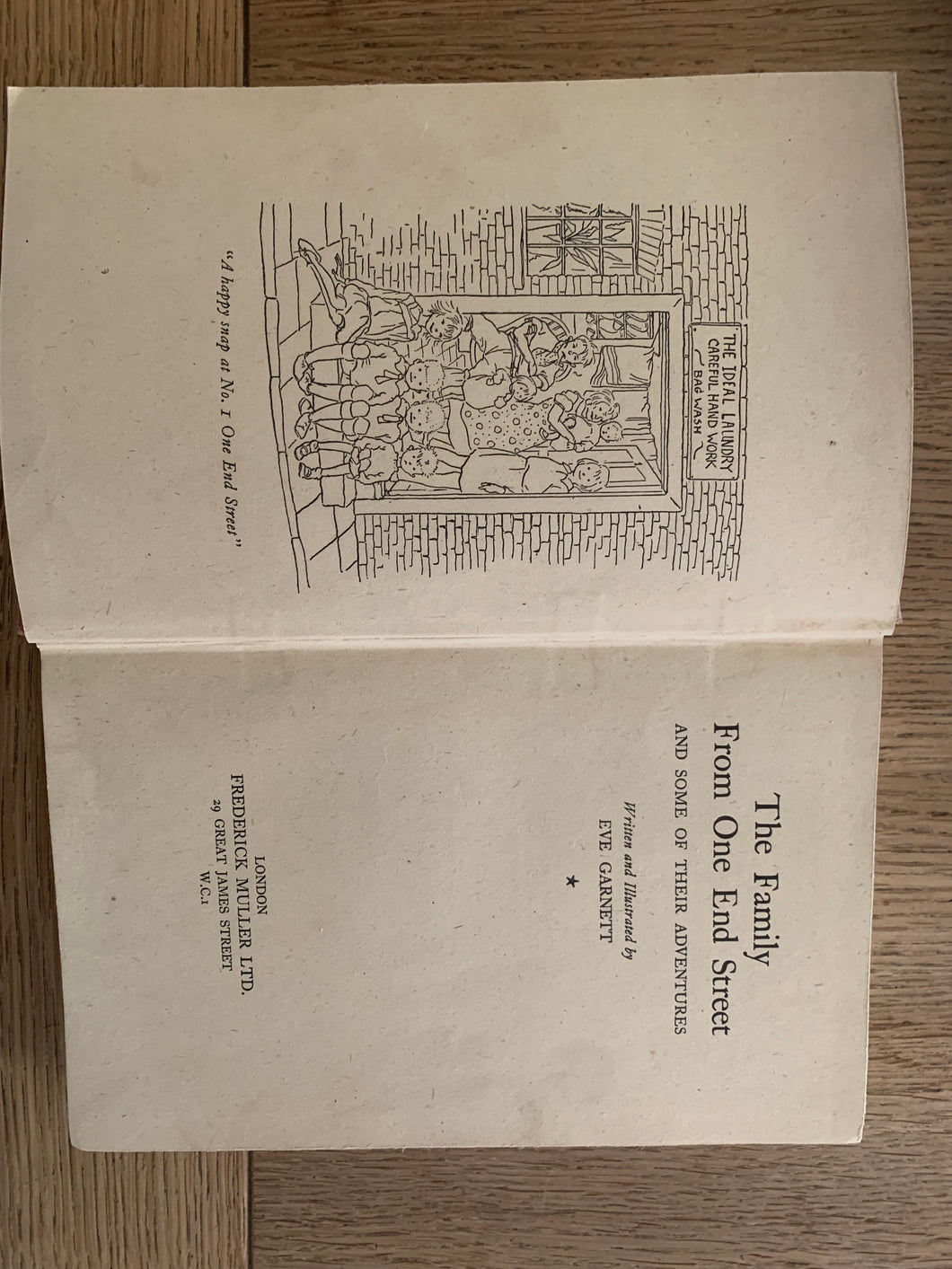 ’The Family From One End Street and some of their adventures’ written and illustrated by Eve Garnett. Published by Frederick Muller. September 1941. UK fourth edition. No dust wrapper.