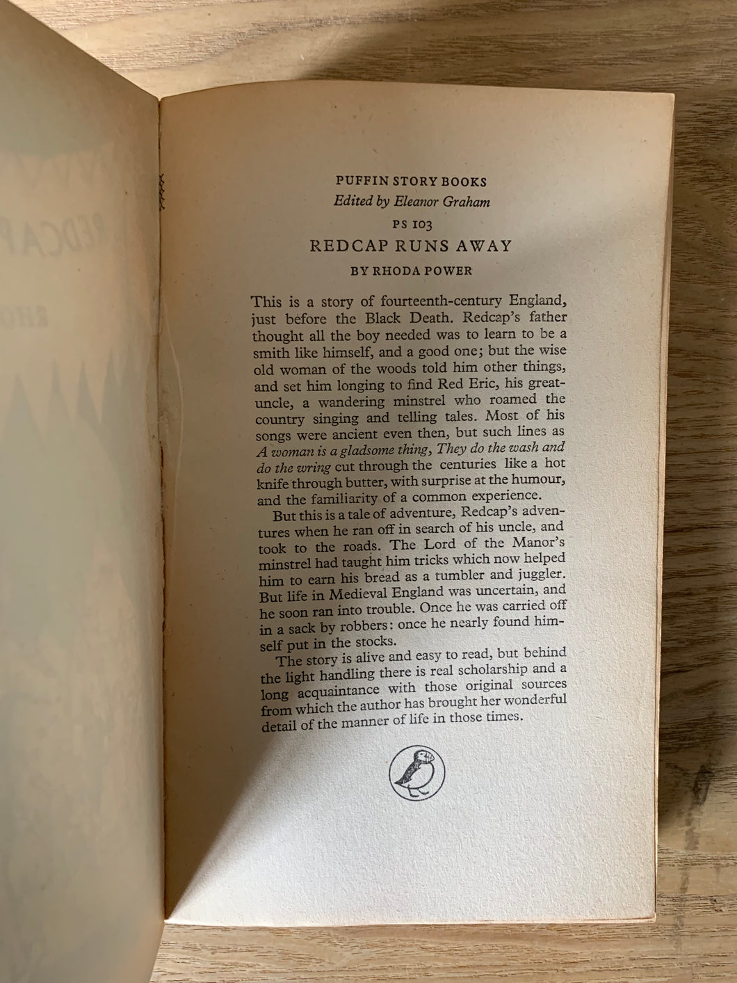 ‘Redcap Runs Away’ by Rhoda Power. Illustrated by C. Walter Hodges. Published by Puffin Books. 1957. UK 1st edition thus. Card Covers. Number 103.