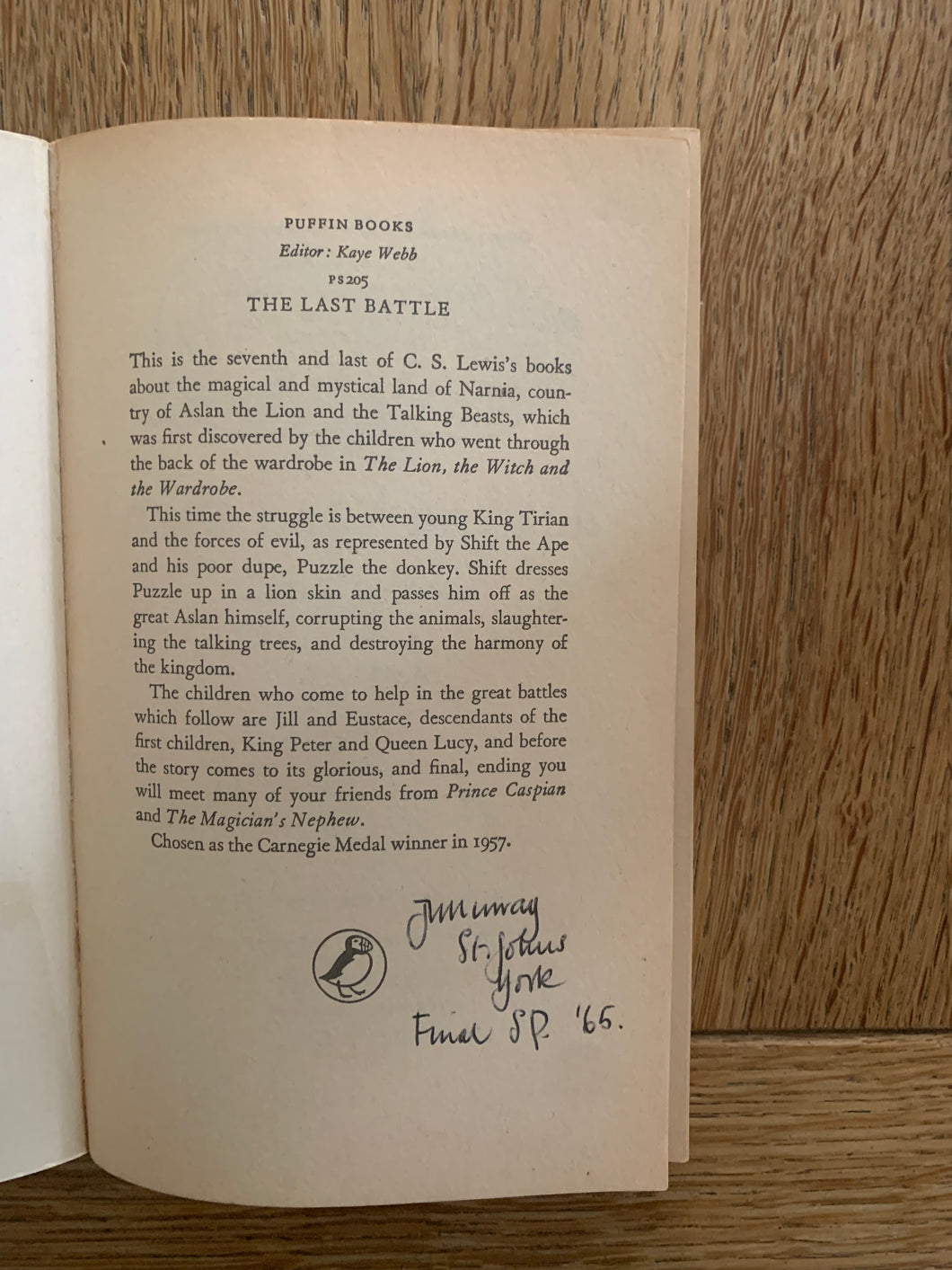 ‘The Last Battle’ by C.S. Lewis Illustrated by Pauline Baynes. Published by Penguin Books. 1964. UK 1st edition. Card Covers. A Puffin Book.