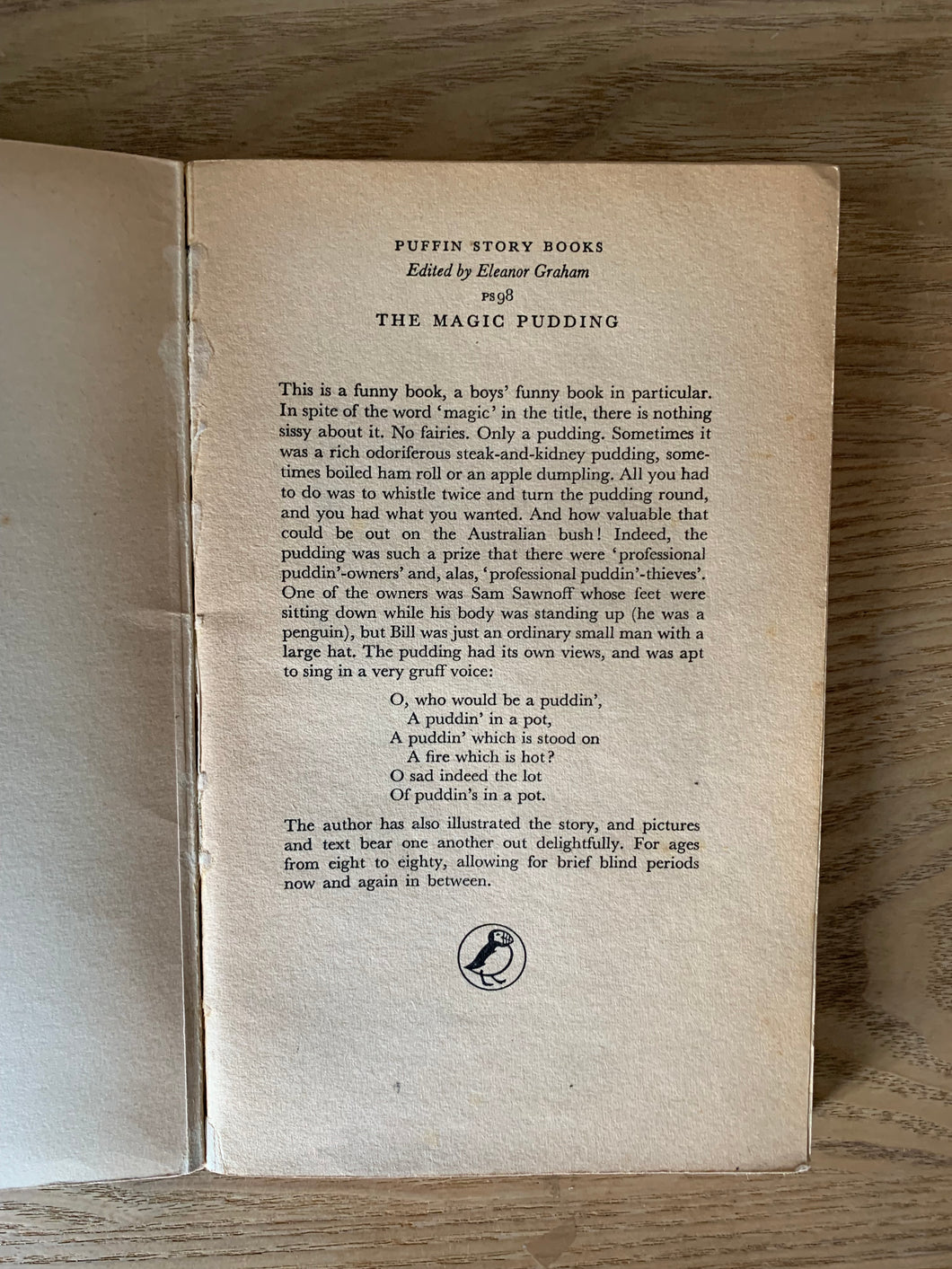 ‘The Magic Pudding’ written and illustrated by Norman Lindsay. Published by Puffin Books. 1957. UK 1st edition thus. Card Covers.