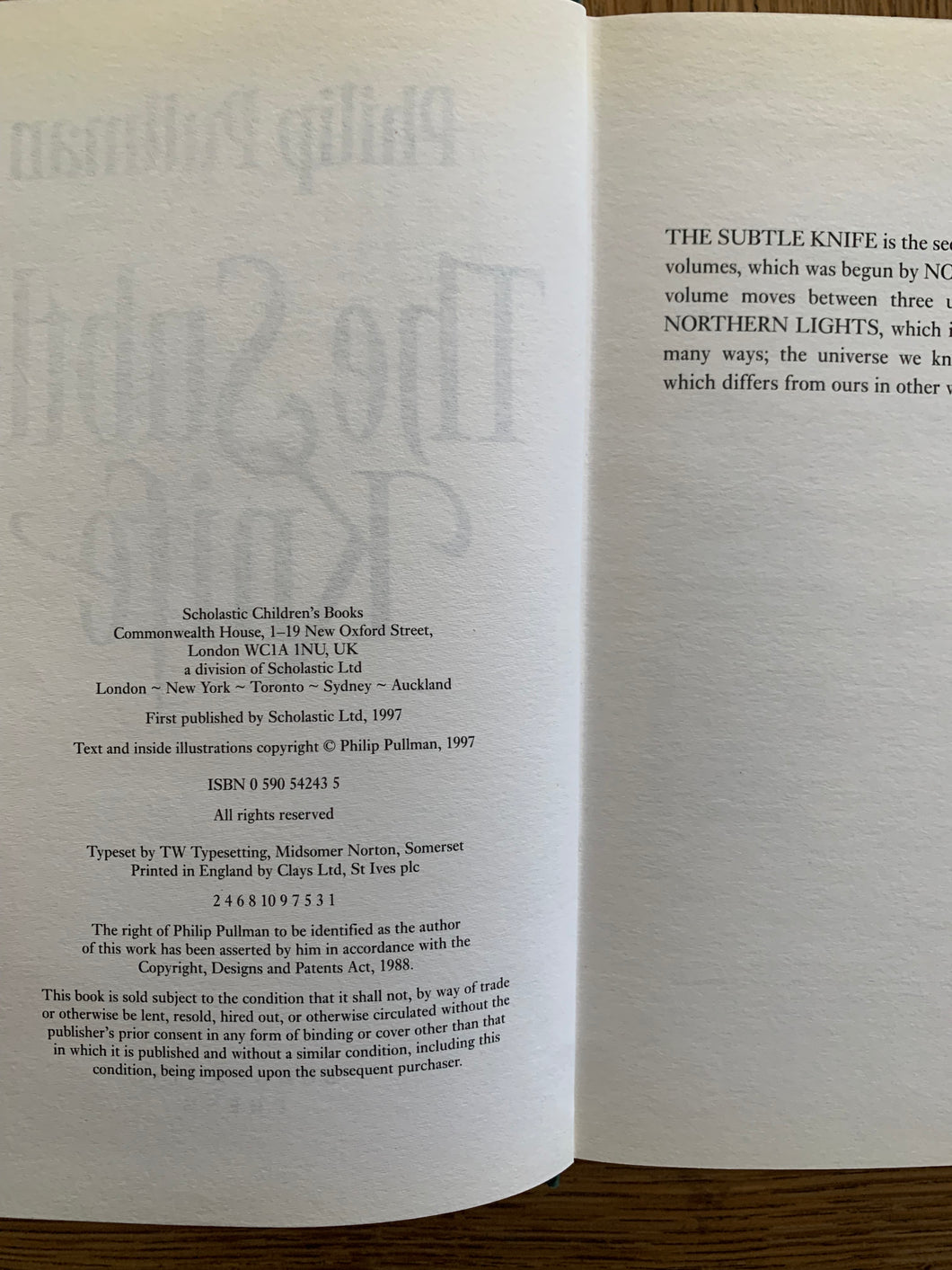 ‘The Subtle Knife’ by Philip Pullman. Published by Scholastic Press. 1997. UK 1st edition.