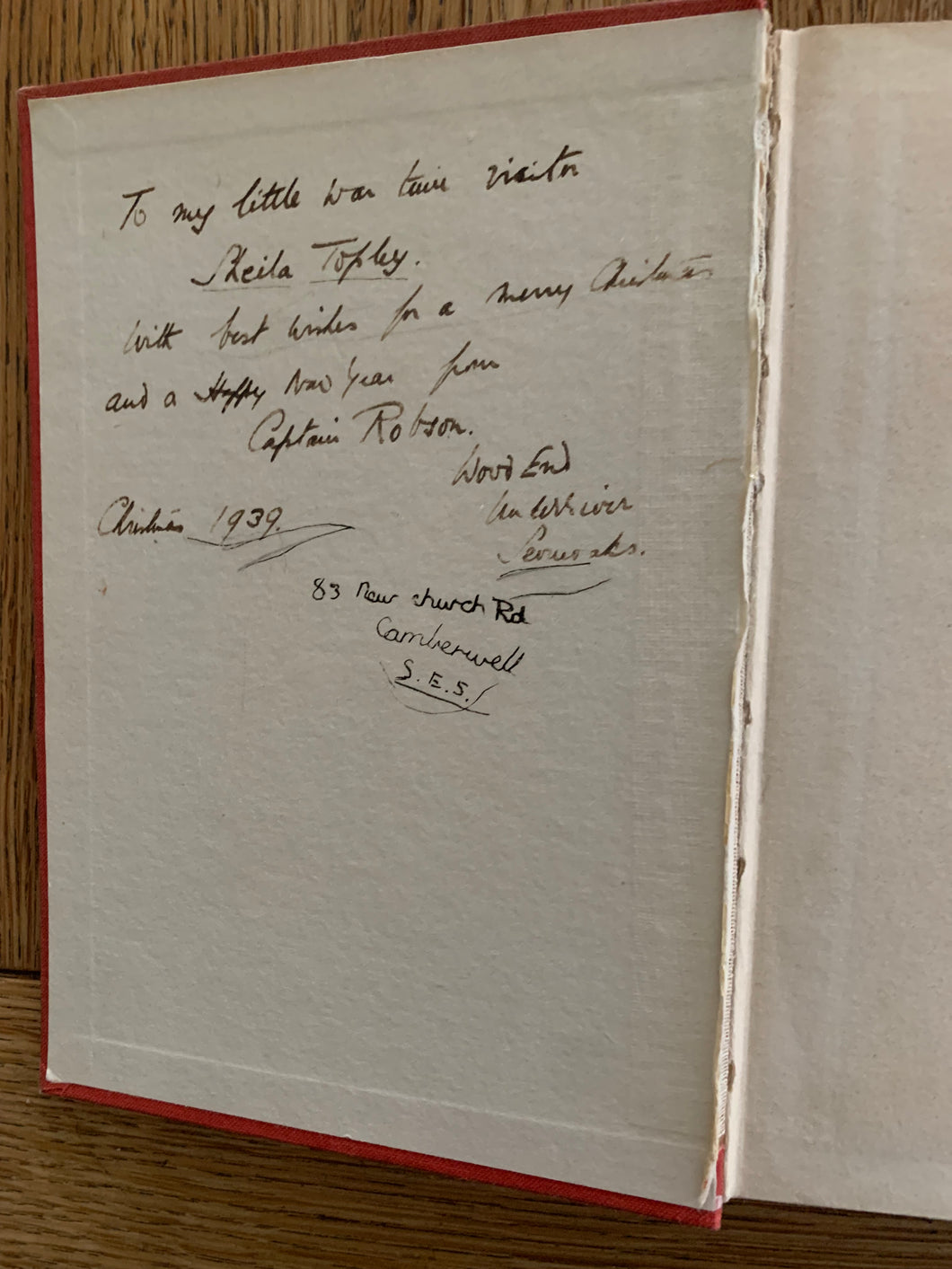 The book is in very good condition with a detailed inscription dated Christmas 1939 plus an address written on the inside of the front cover page. There is bumping and wear to the top/base and edges of the spine and corners. There is wear and loss/tears to the fore-edge of page 11/12 (as if the page has been pasted in the wrong way round and subsequently removed) and a tear to the fore-edge of pages 149/150 and 151/152.