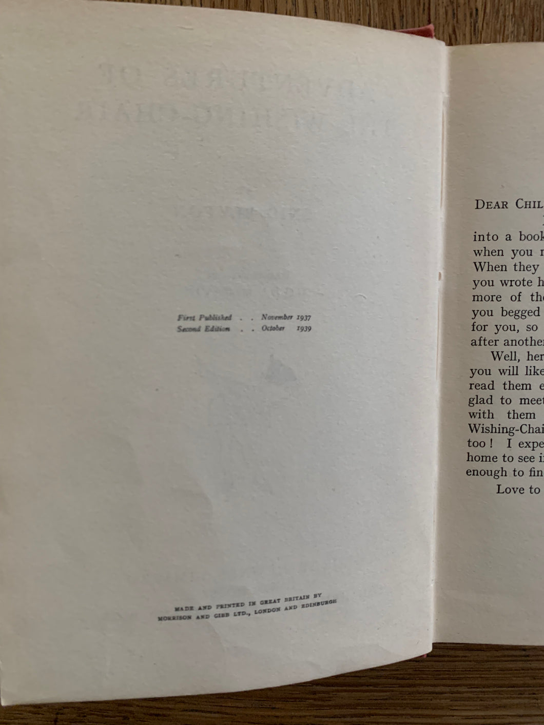 ’Adventures of the Wishing Chair’ by Enid Blyton. Illustrated by Hilda McGavin. Published by George Newnes. October 1939. UK 2nd edition. Picture on-lay to front cover. No dust wrapper.