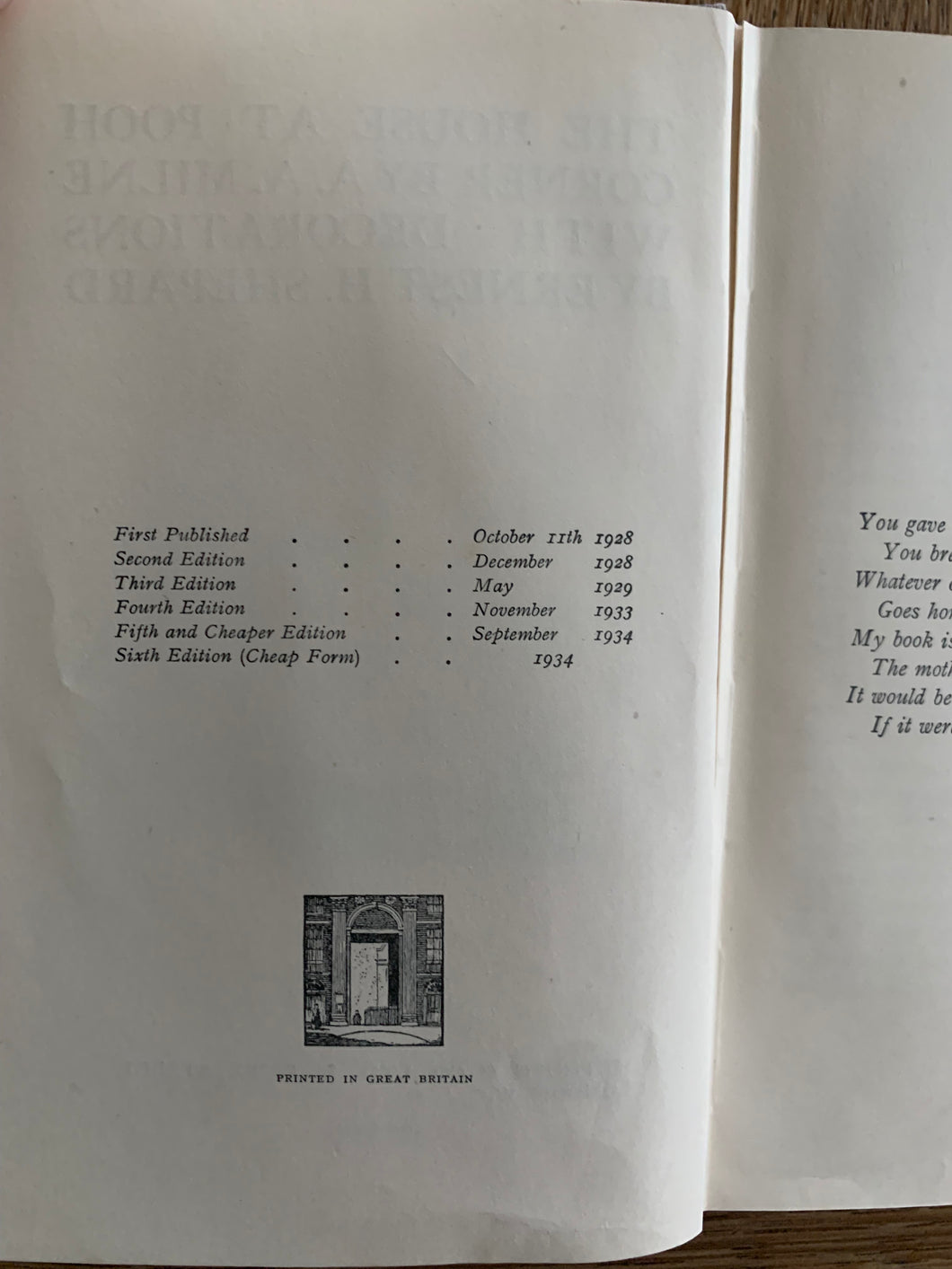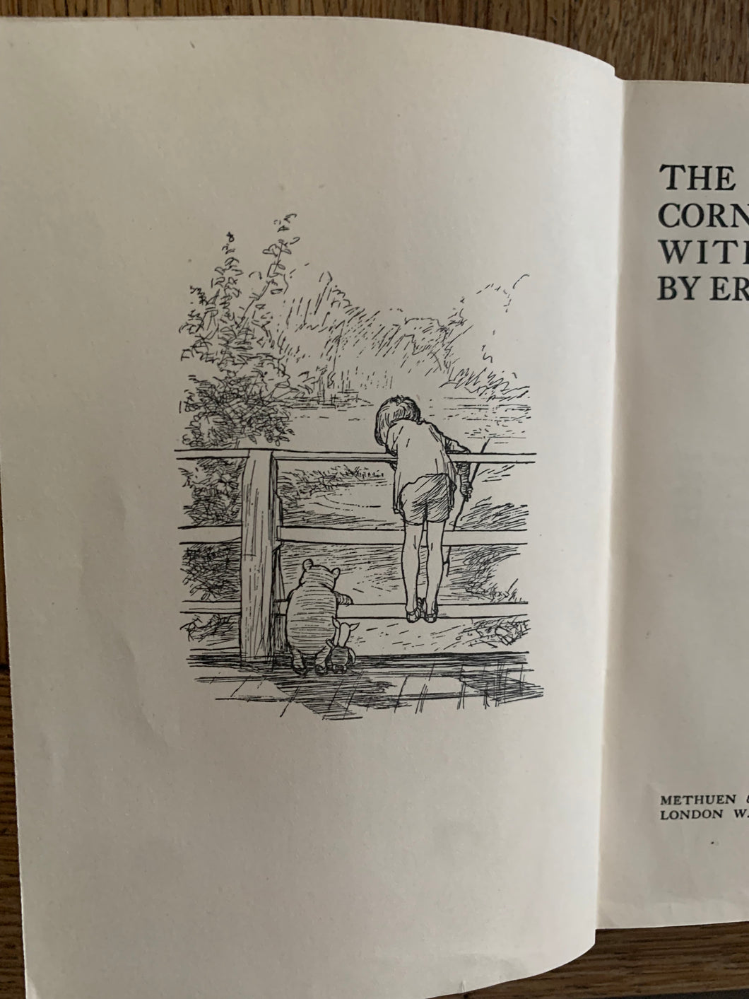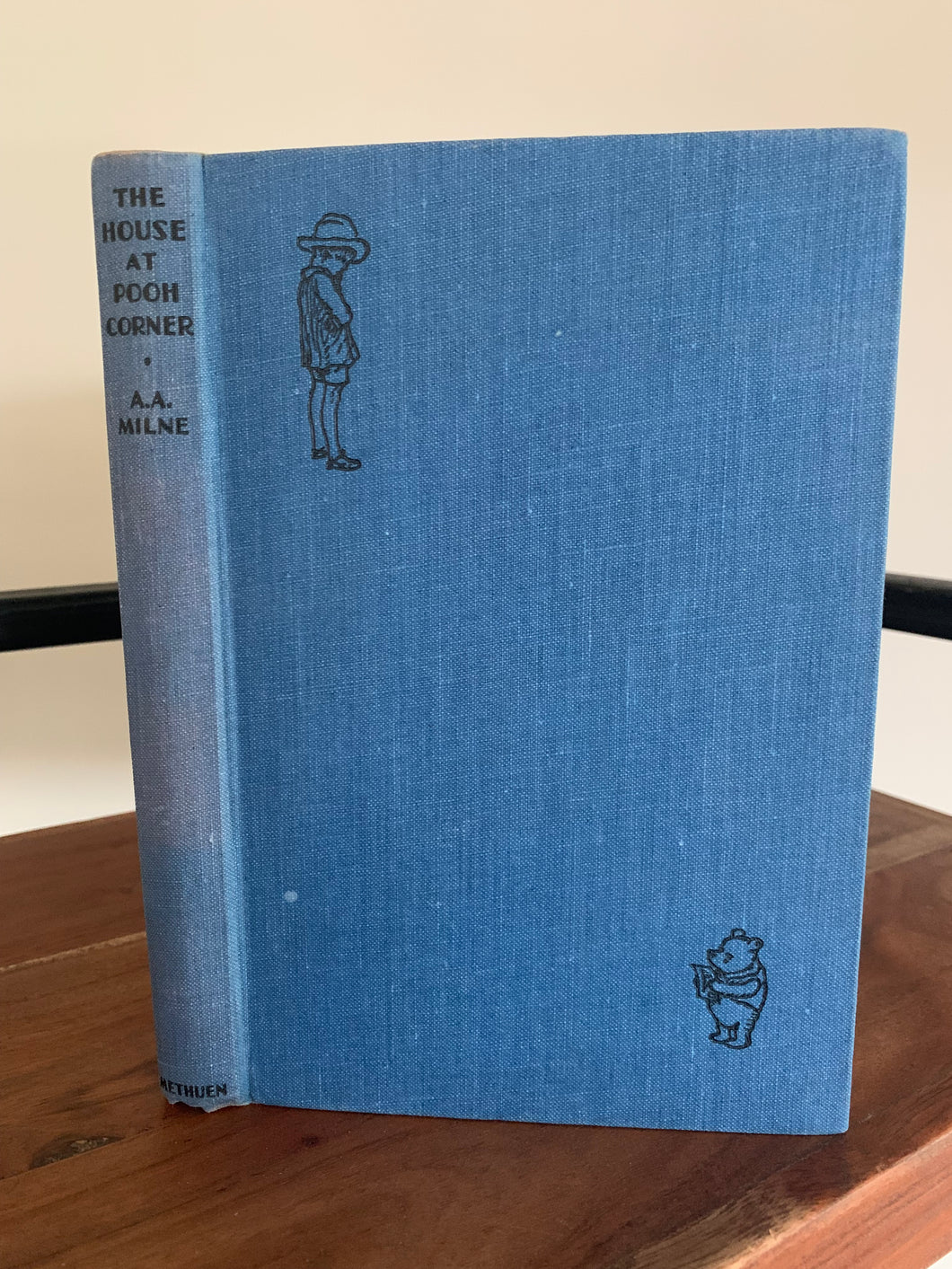 ’The House At Pooh Corner' published by Methuen. 1934. 6th edition. The book is in very good condition with with a single name written on the fep, which together with the half title page is foxed. The spine has a slight lean, sunning to the base, and bumping to the corners. The dust wrapper is in very good + condition, with very light wear to the top/base of the spine, which is lightly sunned, and the corners, with a very small mark at the top of the rear cover. The wrapper is not price clipped, and comes in a clear unattached protective cover.