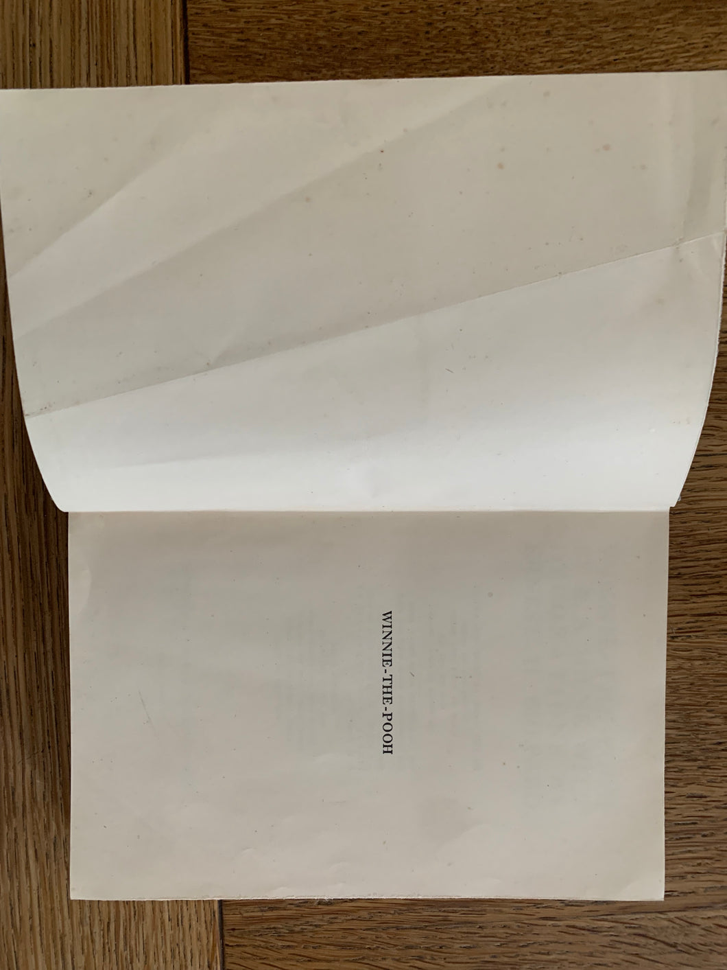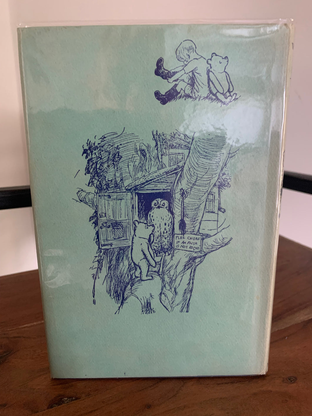 ’Winnie-the-Pooh' published by Methuen. 1934. 14th edition. The book is in very good condition with a single name written on the fep, which together with the first few pages has a crease and occasional foxing. The spine has a slight lean, sunning to the base, and bumping to the corners. The dust wrapper is in very good condition, with very light wear to the top/base of the spine, which is lightly sunned, and the corners. The wrapper is not price clipped, and comes in a clear unattached protective cover.