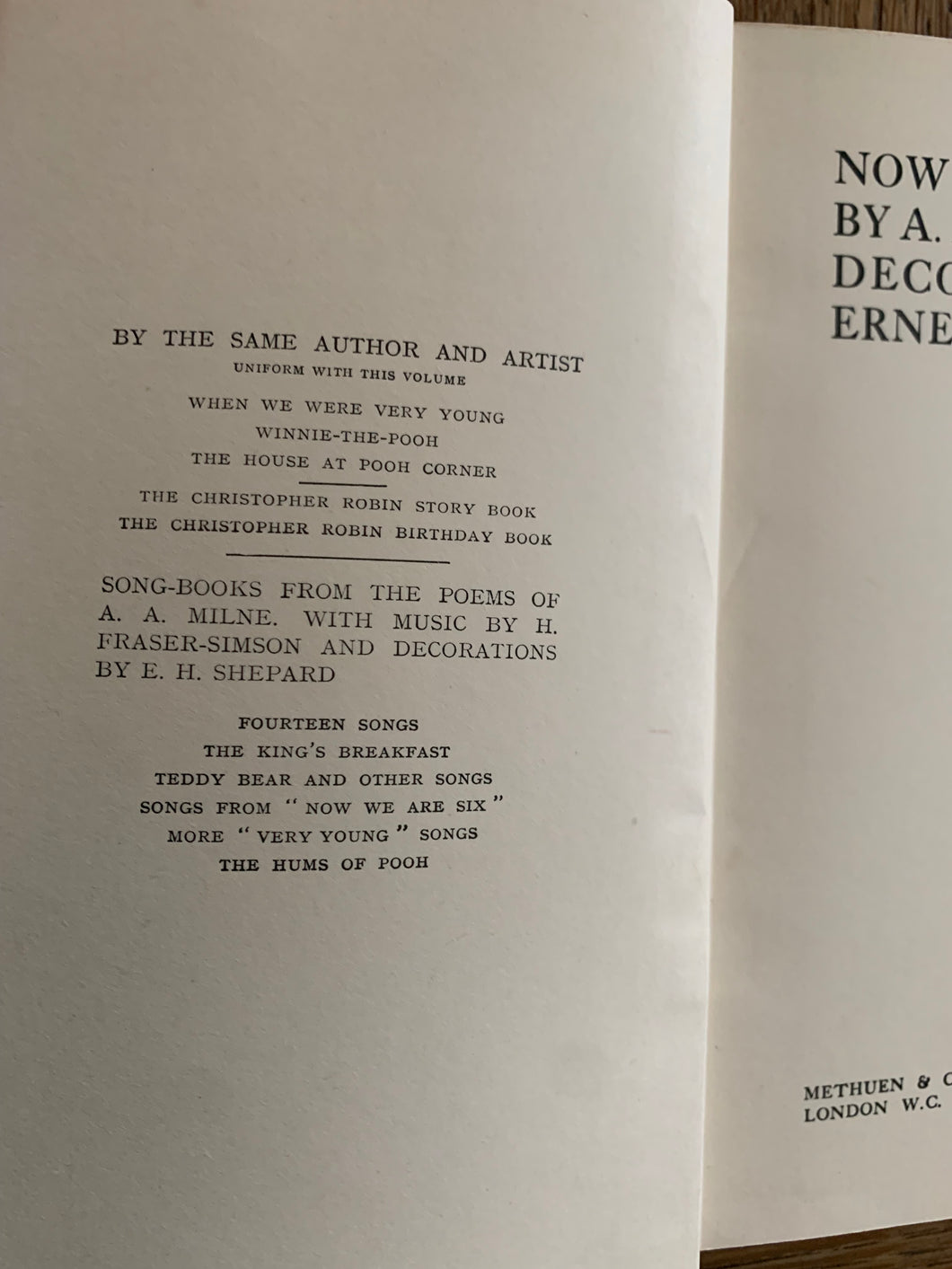 ’Now We Are Six' published by Methuen. 1934. 8th edition. The book is in very good + condition with no marks or inscriptions. The dust wrapper is in very good condition, with very light wear to the top/base of the spine, which is lightly sunned, and the corners, with a couple of marks to the front & rear covers. The wrapper is not price clipped, and comes in a clear unattached protective cover.