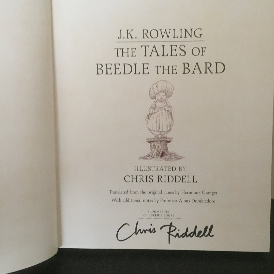 'The Tales of Beedle The Bard’ by J.K.Rowling. Illustrated by Chris Riddell. Published by Bloomsbury. 2018 UK 1st edition thus. Laminated pictorial boards. No dust wrapper as issued.  Signed by the author on the title page without dedication. The former childrens laureate adds his brilliant and vibrant imagination to produce a sumptuous version of this fabulous tale.