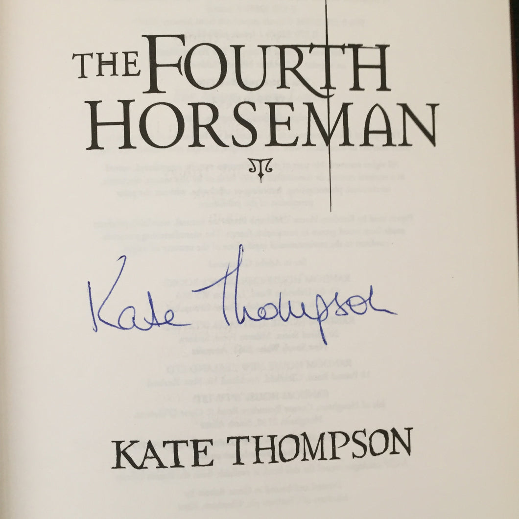 ‘Fourth Horseman’ by Kate Thompson. Published by Bodley Head. 2006. UK 1st edition. Signed by the author without dedication on the title page. The book is in fine condition with no marks or inscriptions. The dust wrapper is in near fine condition and is not price clipped. There is a tiny nick on the bottom of the front cover and a scratch on the rear cover.