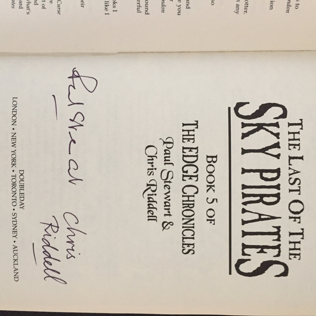 ’The Last of the Sky Pirates. Book 5 of The Edge Chronicles.’ by Paul Stewart. Illustrated by Chris Riddell. Published by Doubleday. 2002. UK 1st edition. The book is in fine condition with no marks or inscriptions. The dust wrapper is also in fine condition and is not price clipped. Signed by both author and illustrator without dedication on the title page. We have other titles from this hugely popular author/illustrator team.