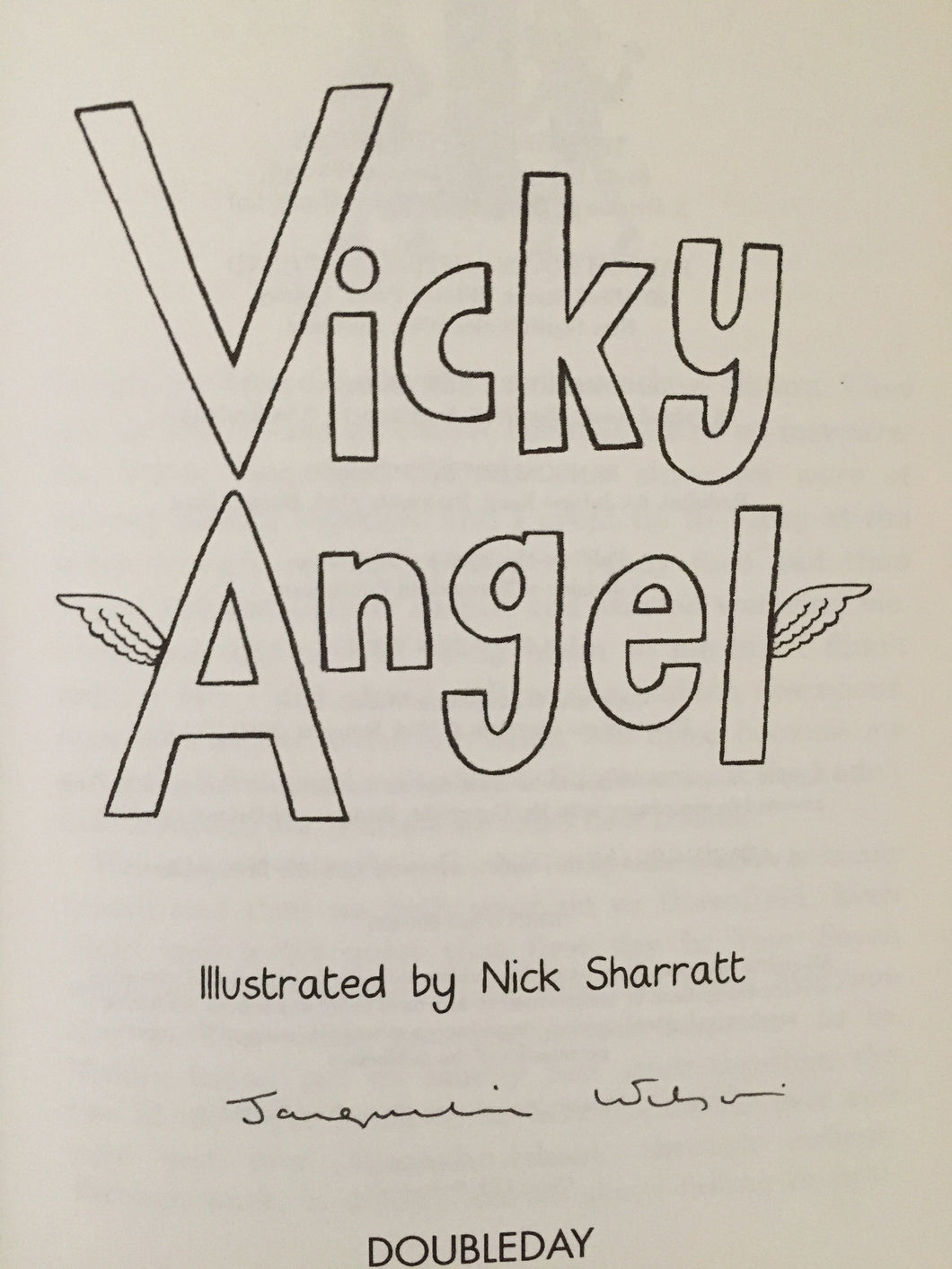 ‘Vicky Angel’ by Jacqueline Wilson. illustrated by Nick Sharratt. Published by Doubleday. 2000. UK 1st edition. Laminated pictorial boards. No dust wrapper as issued. The book is in near fine condition, with no marks or inscriptions. There is a small amount of wear to the top corner. Signed by the author on the title page without dedication.