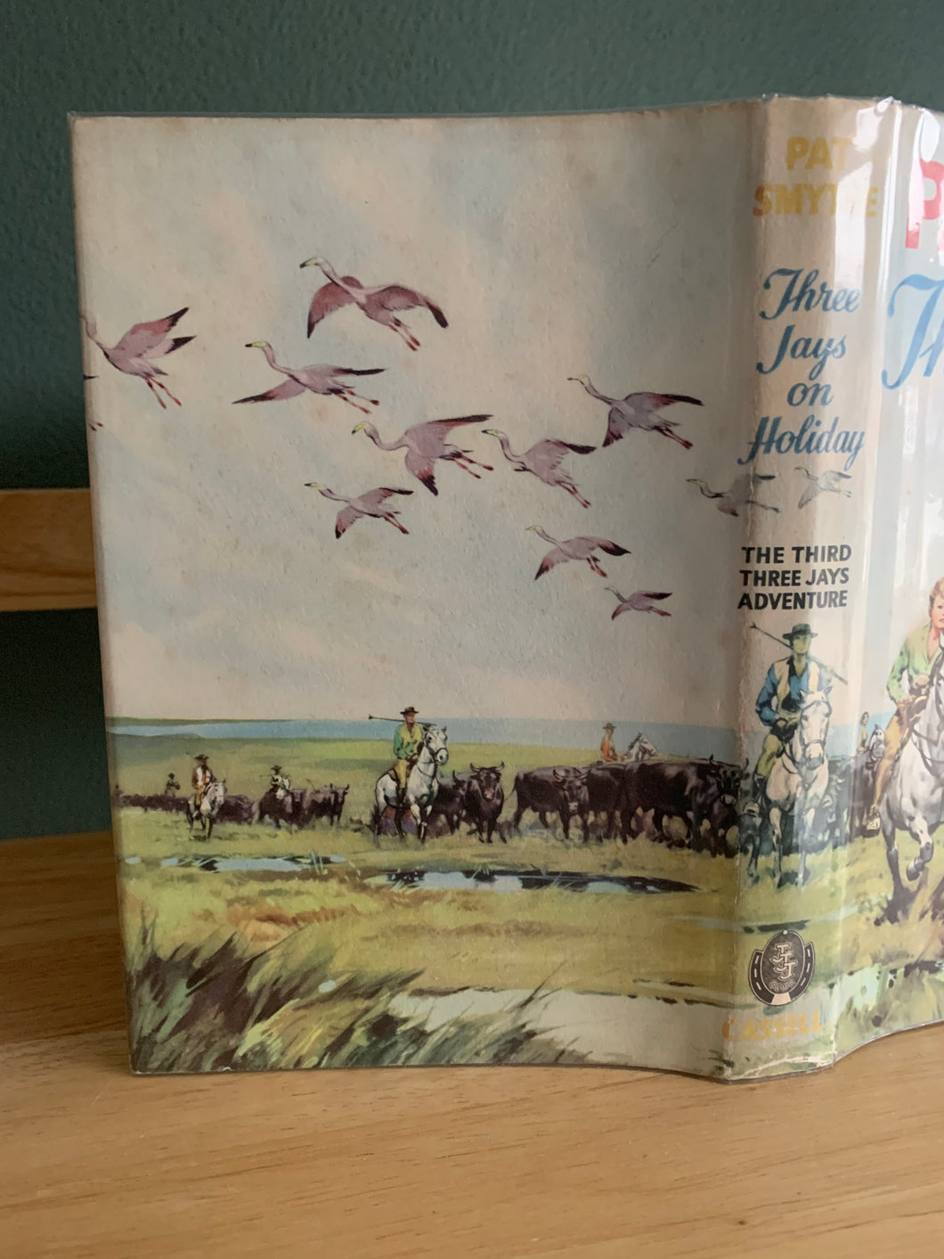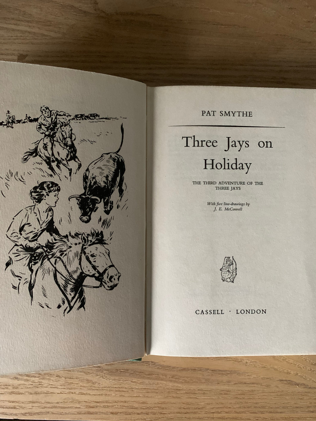 ’Three Jays on Holiday’ by Pat Smythe. Illustrated by J.E. McConnell. Published by Cassell 1958. UK 1st edition. The book is in very good + condition with no marks or inscriptions. There is some light foxing to the end papers.